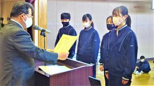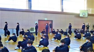 12月11日(金)、12日(土)に行われる秩父地区中学校スポーツ交流大会に向けて生徒会長から激励の言葉が贈られ、各運動部の部長からは大会への決意が述べられました。