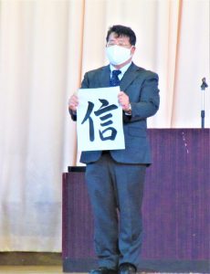 校長先生からは「信」という文字が示され、生徒へ大会へ向けの願いが伝えられました。