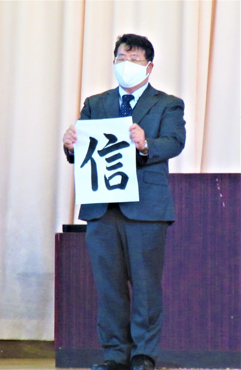 校長先生からは「信」という文字が示され、生徒へ大会へ向けの願いが伝えられました。