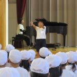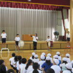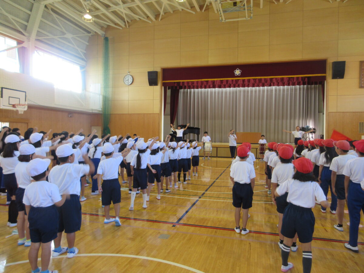 今朝は、音楽集会でした。運動会の歌「ゴーゴーゴー!」を全校で歌いました。「100%の力を出して歌おう」を目標に、「フレー!フレー!赤/白組!・・・・」各団長さんの声に合わせて、気合いを入れて歌いだしました。「ゴーゴーゴー!!」のところは、かっこよく腕を振り上げました。みんなの声が一つになって体育館中を駆けまわり、歌声シャワーになって落ちてきたようでした。運動会まで、もう少し!!歌うことも一生懸命な尾小っ子の活躍がますます楽しみです。