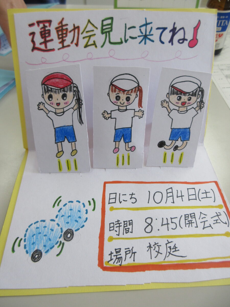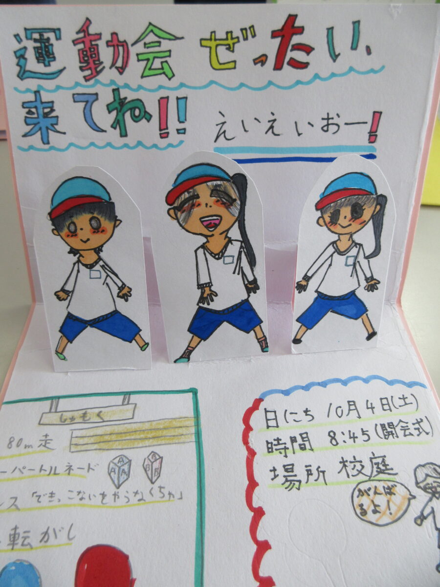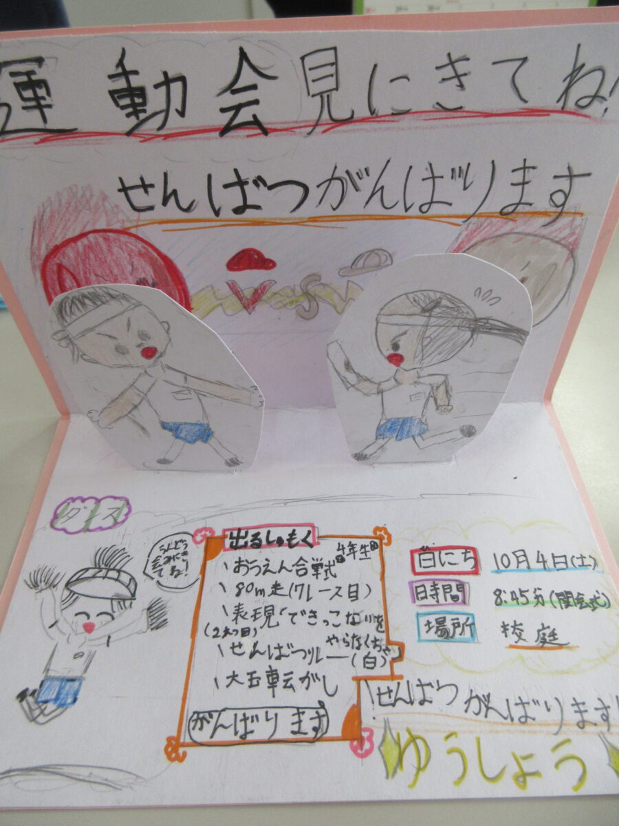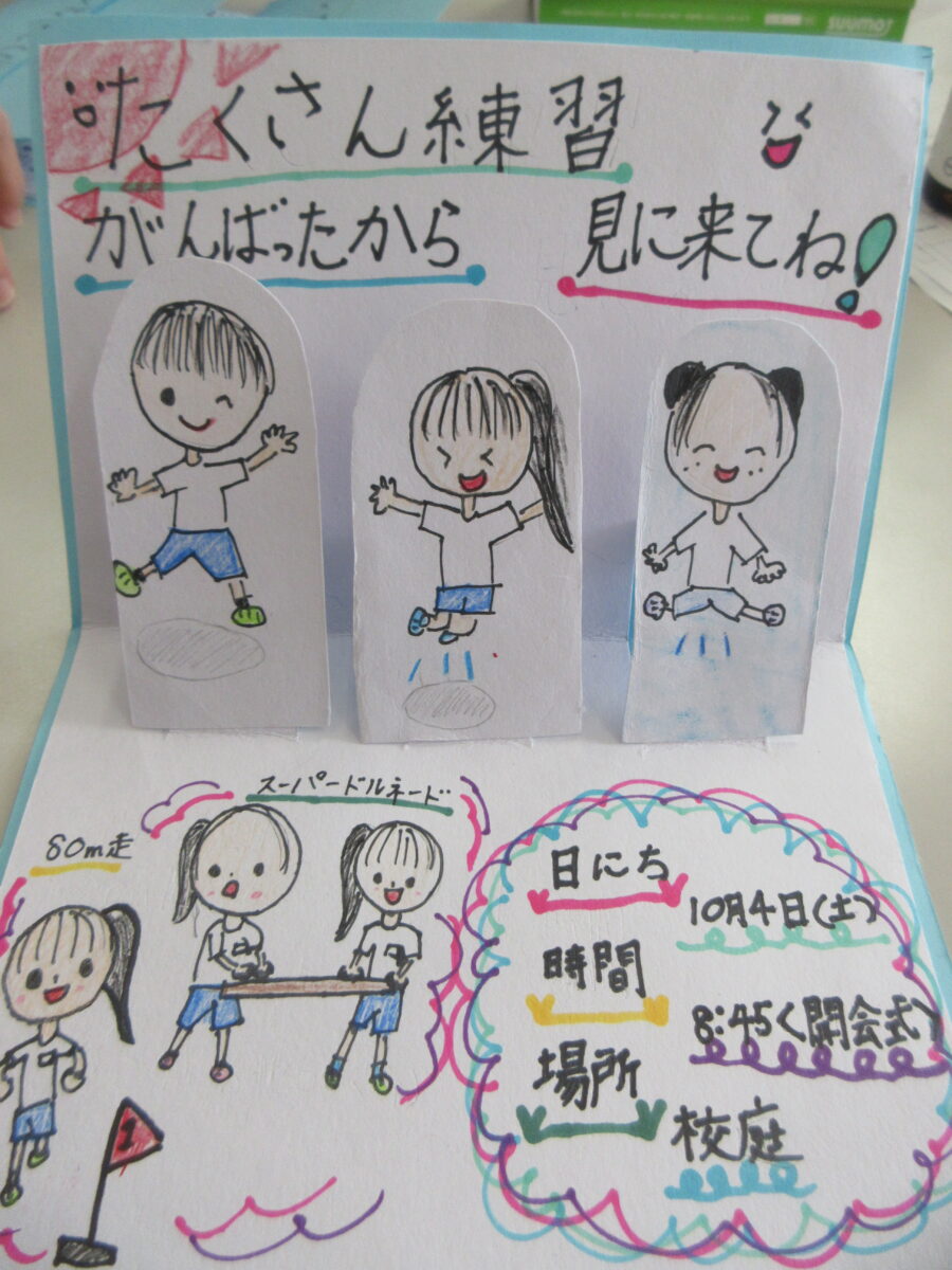 いよいよ今週10月4日(土)が運動会です。暑さに負けず、練習も全力で頑張ってきました。ぜひ、運動会に起こしいただき、大きな声援をお願いいたします!4年生が運動会招待状を作成しました。いつも応援してくれる皆さんに感謝の気持ちを込めて、招待状も全力で作りました。