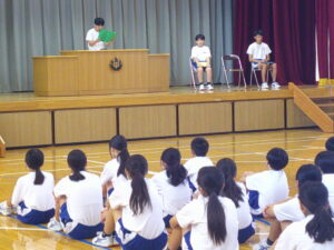 また、終業式中では、校長先生から「イメージのプール」というお話がありました。暑すぎる日は、涼しい場所で冷たい飲み物を飲みながら読書をするのもおすすめです。ぜひ、この夏読みたい本を近くにおいて、「イメージ」を広げる夏休みにしてみてください。