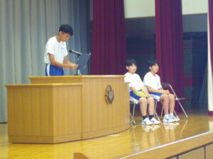 県大会出場となるサッカー部、卓球部、陸上部の選手は、暑い中での戦いとなりますが、熱中症に気をつけ力を出し切ってほしいと思います。
