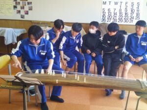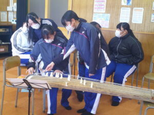3年生の音楽の授業では、箏の学習。この単元では、箏曲について、音楽の特徴とその背景となる文化や歴史との関わりだけでなく、楽器の音色、響き、奏法について学習します。おなじみの「さくらさくら」の曲を練習しています!古くに生まれた弦楽器であり大きさもあるため、なかなか本物に触れる機会も少ないと思います。限られた時間ですが、音楽の授業でじっくりその魅力を味わっていきます。