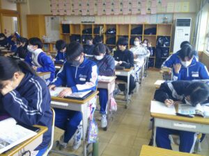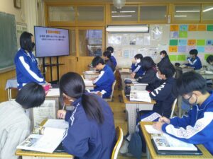 3年生は期末テストも終わり、どの教科でも学習のまとめに入ります。社会の授業では、自分自身で調べたことや大切な内容を簡潔にまとめ、スライドで発表していました!今日は国際社会や国際問題の内容がメイン。発表を聞いたり教科書で確認しながら学習のまとめを進めていました。明日も発表が続くようですので、他の生徒の発表から大切な内容を落とさず学んでいきましょう!