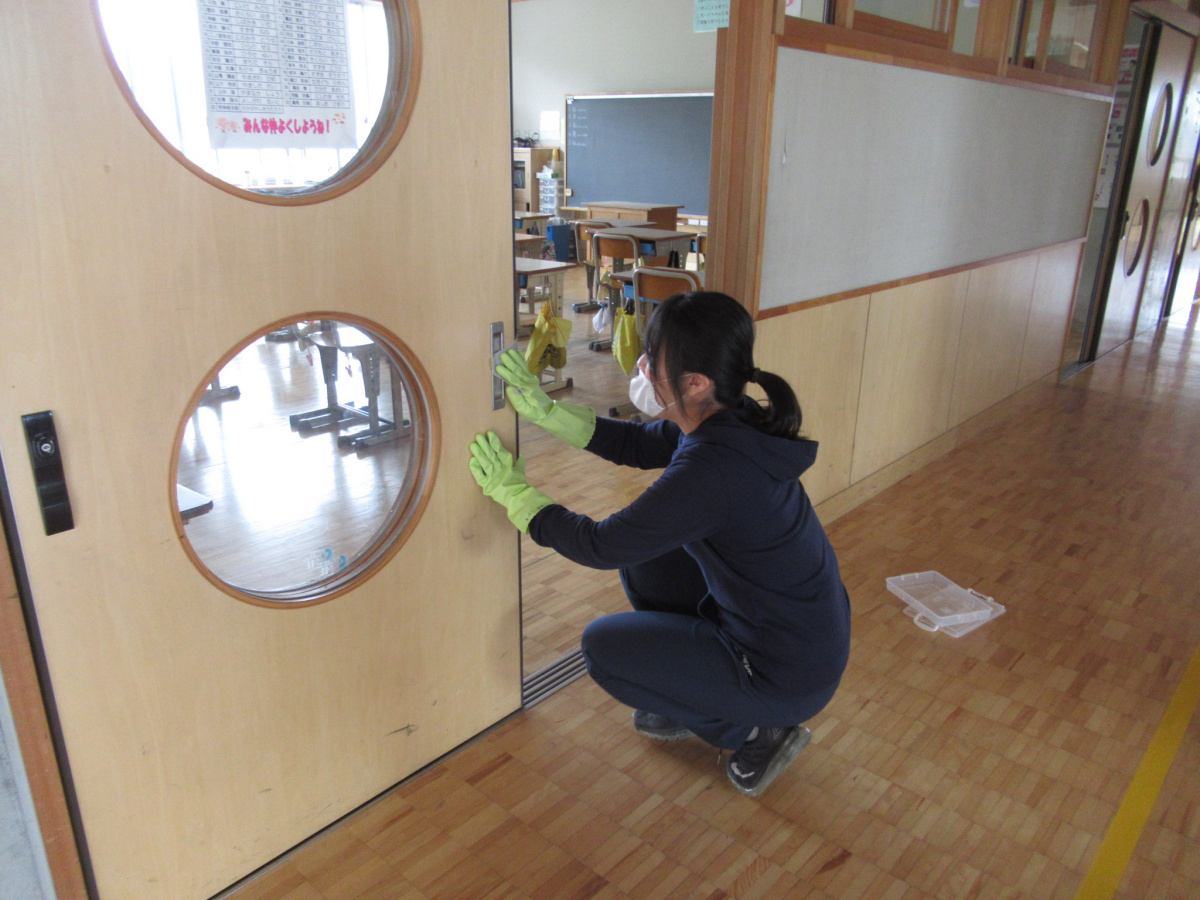 朝、登校時に昇降口でウィルス感染防止のための消毒をしたり、児童が帰った後、職員が教室の清掃やドア、机等の消毒をしたりしています。児童の皆さんもきちんとした手洗いを心がけましょう。