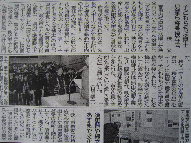 ・秩父市で行っている「子どもちちぶ学士・博士」の表彰で2年生の神楽伝承学習が表彰されました。2年生を代表して新井めぐみさんに出席してもらいました。