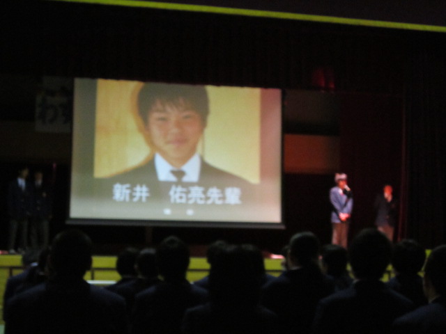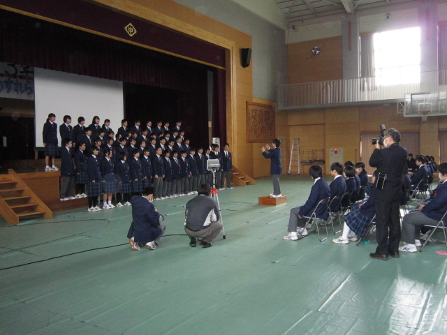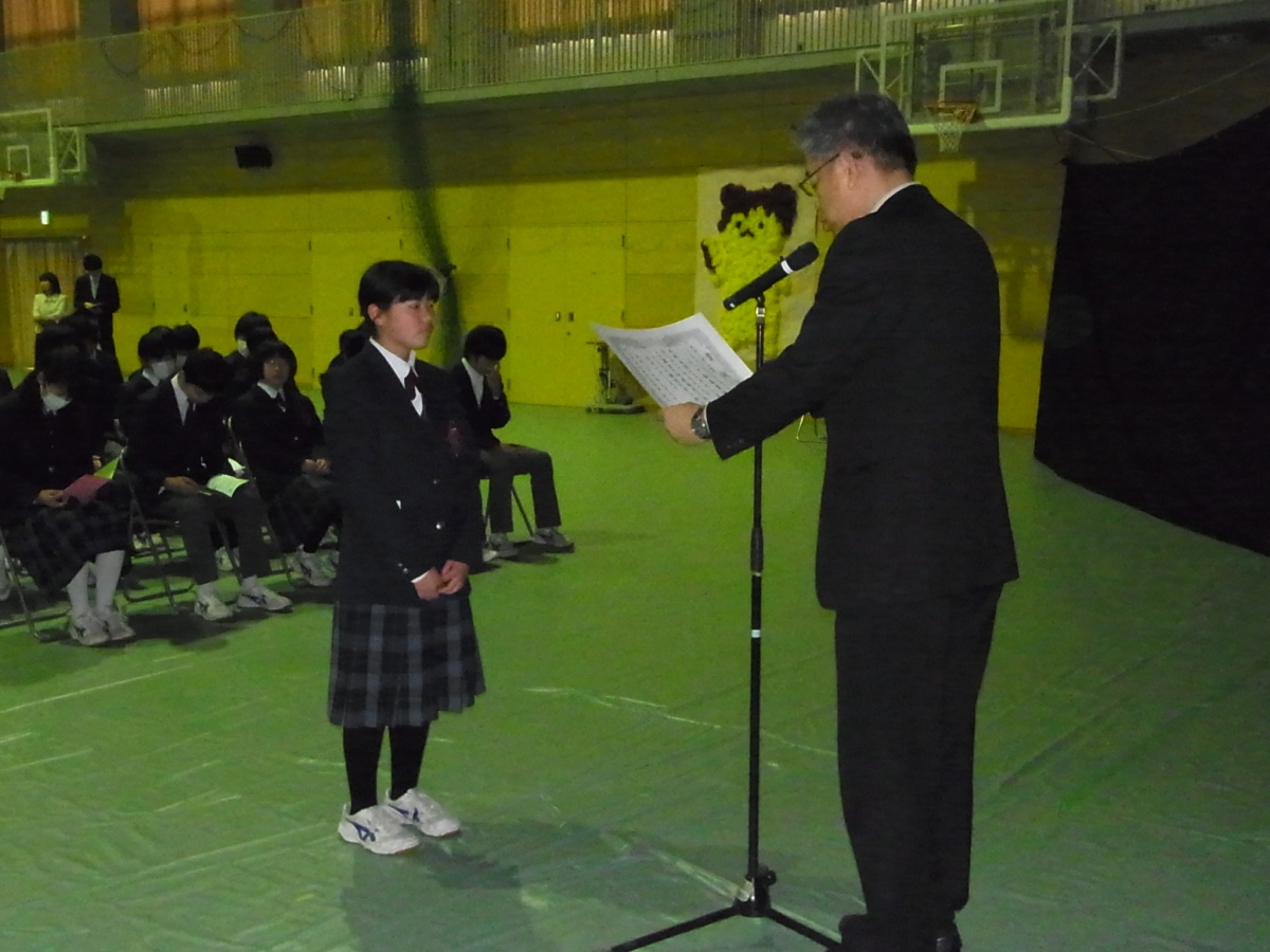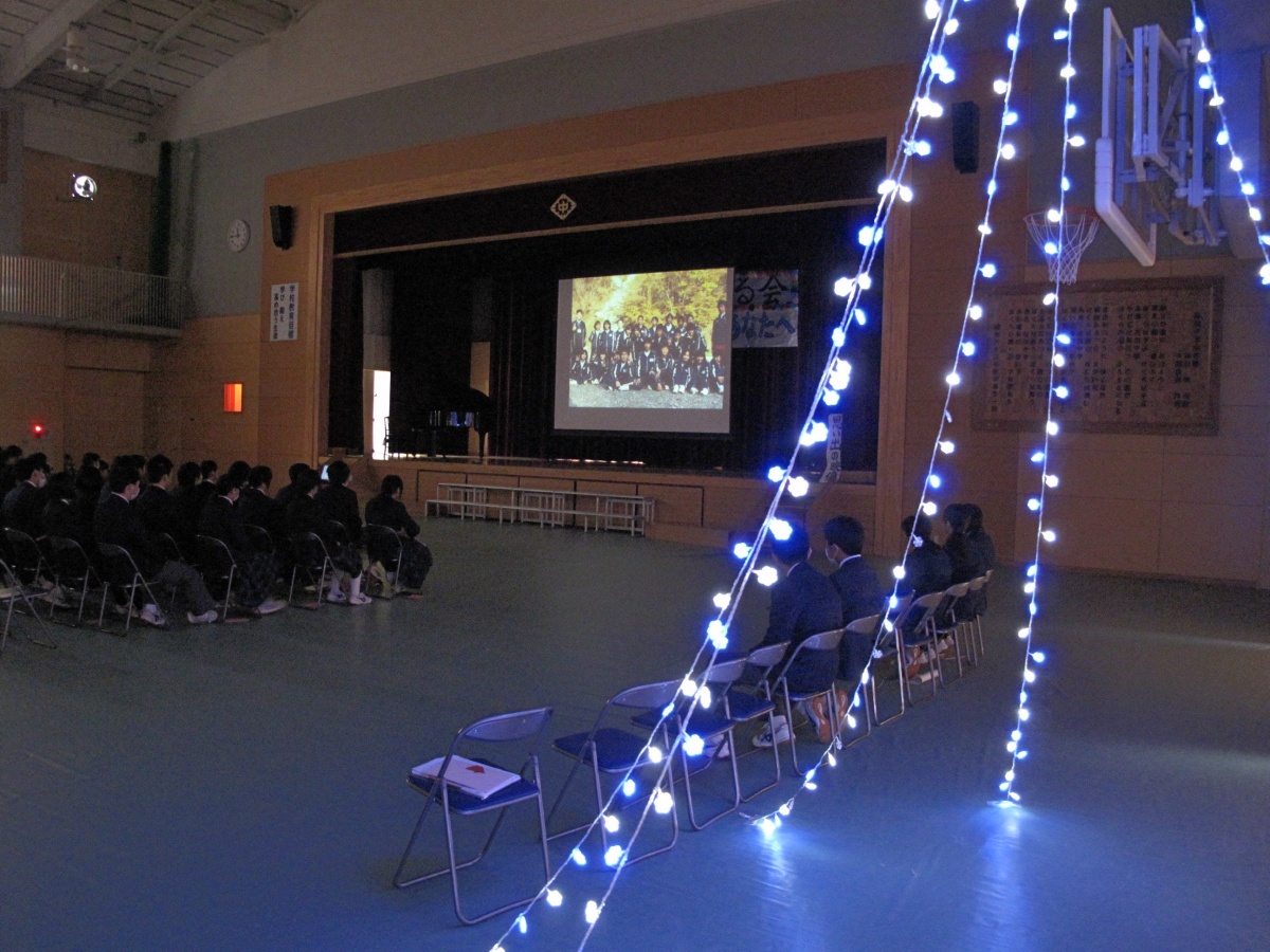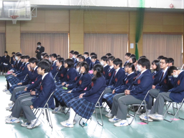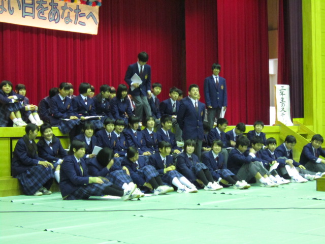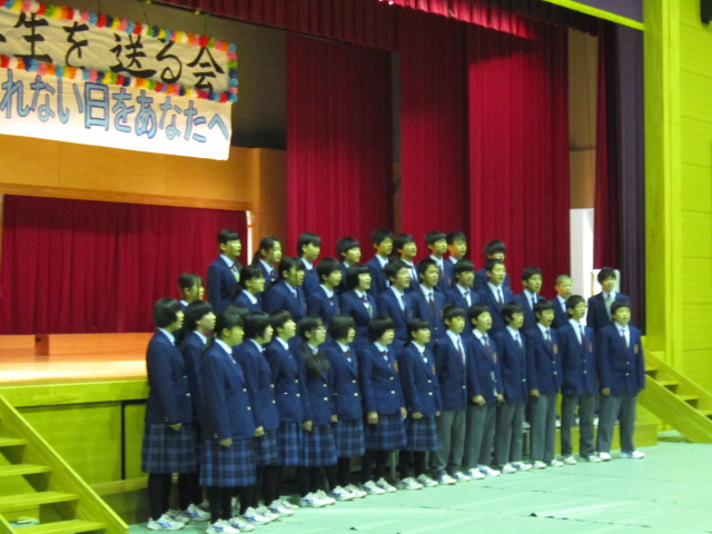 9日(月)3年生を送る会がありました。「忘れられない日をあなたに」(2年金森里佳子さん)をスローガンに、葭田実行委員長を中心に準備してきました。前半は劇団民話芸術座による「おけさのひょう六」という劇で、3年生の杉山さんが出演し、見事な演技を見せてくれました。後半は1年生(卒業一人一人への感謝の言葉と合唱)、2年生(ダンスやパフォーマンスと感謝の言葉と合唱)の出し物、先生方の合唱や思い出のスライド、AKBの音楽にのせた先生方や保護者、小学校の先生も出演したPVを流しました。またサプライズで現在川崎フロンターレに所属しているJリーガーの新井章太さん(H15年度卒)からもお祝いメッセージをいただきました。3年生からも全職員への感謝の手紙と在校生への熱いメッセージと合唱をおくってもらいました。スローガンどおり忘れられない、楽しく温かい3年生を送る会になりました。多数の地域・保護者の方にも寒い中ご覧いただきありがとうございました。