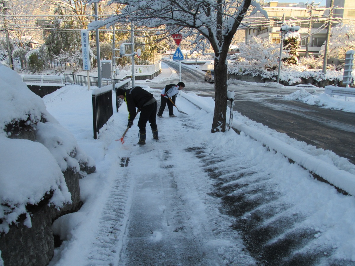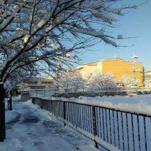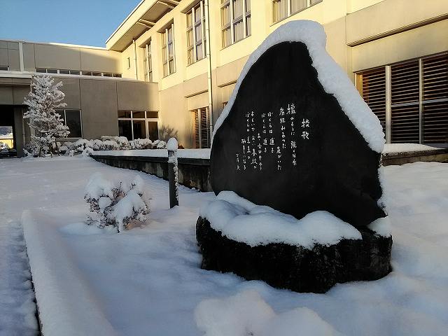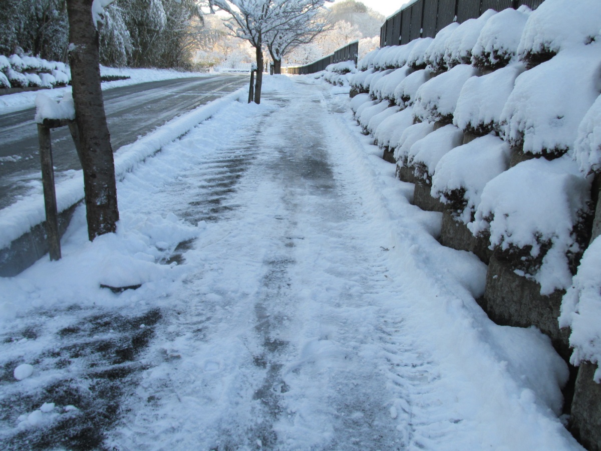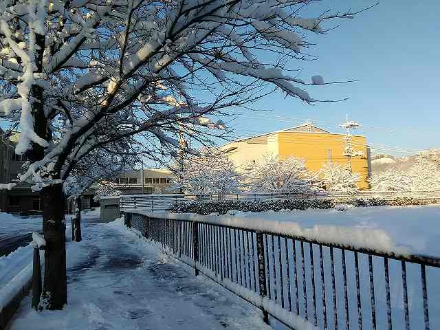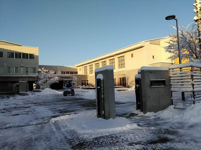 積雪の影響で本日は、2時間遅れ(10時25分)登校となります。路面はまだ凍結状態です。登校する際は、早めに家を出て、ペンギンのように歩幅を小さくして、スリップに十分注意して登校してください。