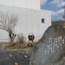 荒舩様のご厚意でご寄贈いただくことになったまゆみの木。12月28日には有志の生徒で掘りに行きましたが、本日、学校応援団の富田様にご尽力いただき、本校歌碑の後に移植しました。今回は生徒のお陰で丁寧に根を残して移植できました。校歌2番の「まゆみのように強くなれ」という歌詞のような吉中生を目指してください。