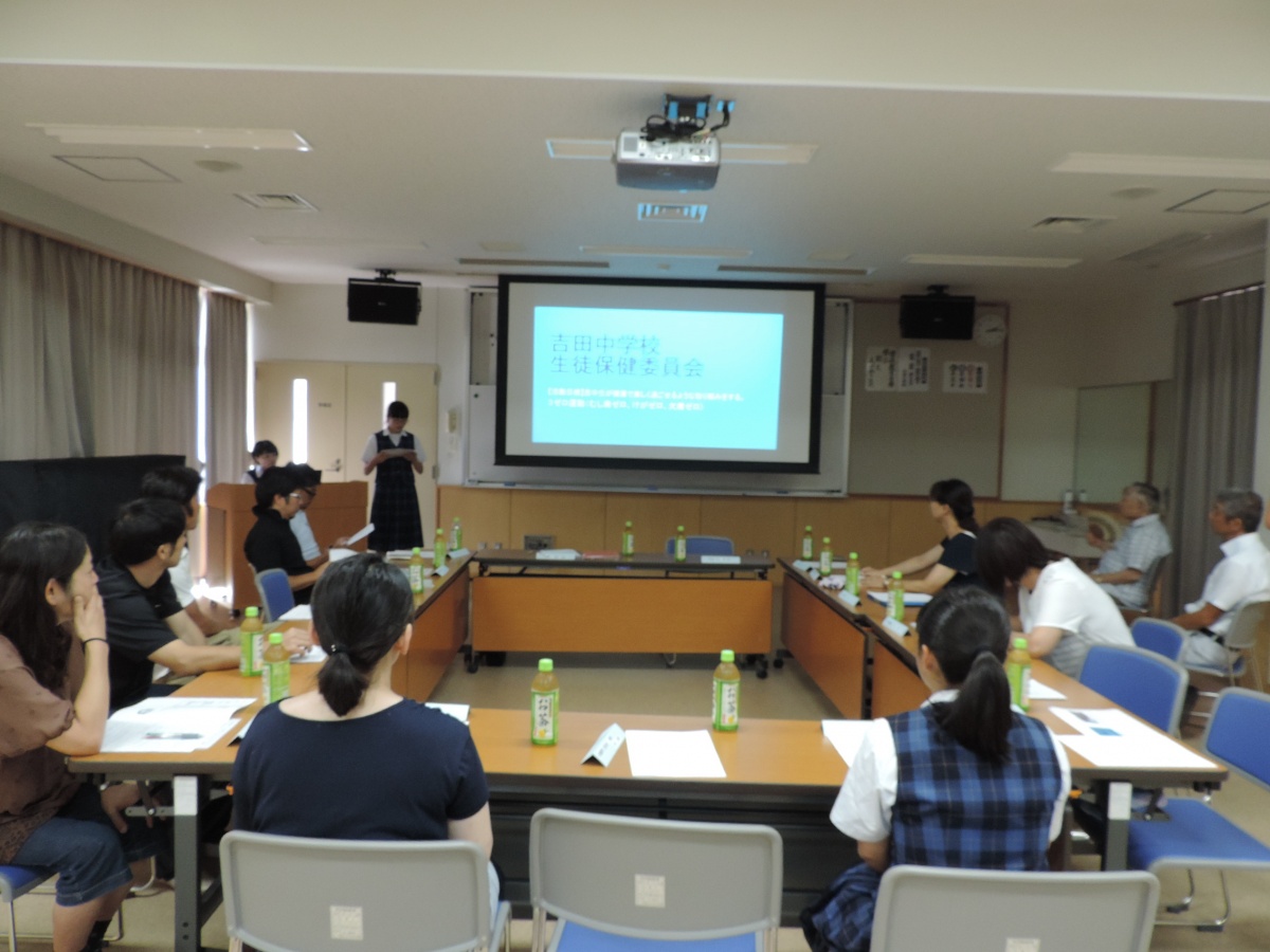 午後2時10分より多目的室で学校保健委員会を開催しました。学校医の新井先生をはじめ、PTAからは会長の新井様、保健厚生委員長の加藤様をはじめ総勢6名の役員の皆様に御出席いただきました。この学校保健委員会は、昭和33年に学校保健法に基づく健康等に関する教育活動をより効果的にするために、当時の文部省局長通知で開催が求められました。本校では毎年2回開催し、学校保健について本校の現状や課題を報告し、委員の皆様から助言をいただいております。本日は保健委員会の活動や身体測定・スポーツテストの結果を報告しました。学校医の新井先生からは、特に「熱中症対策」について御指導を賜りました。今後の教育活動に役立てていきたいと思います。