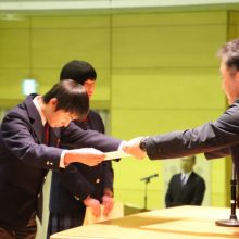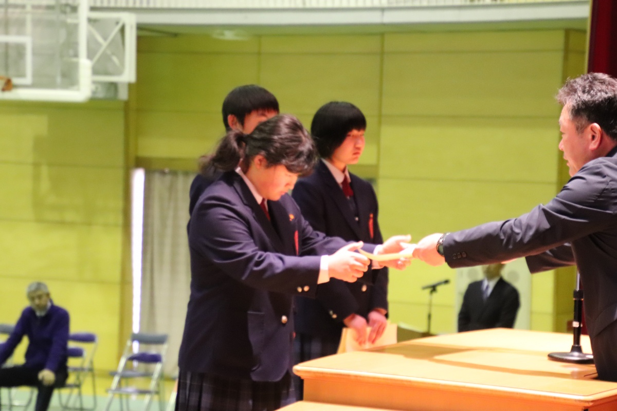 午後の式場準備の前に3年生の生徒表彰を行いました。これは、学業、勤労精神、体育で他の模範となる実績をあげた生徒を表彰するものです。県教育委員会表彰は中嶋萌々香さん、産業教育表彰は島﨑陽向くん・宮部渓永さん、県体育協会表彰は坂本愛美さんが、それぞれ受賞しました。3年間の努力が報われてよかったです。おめでとうございました!