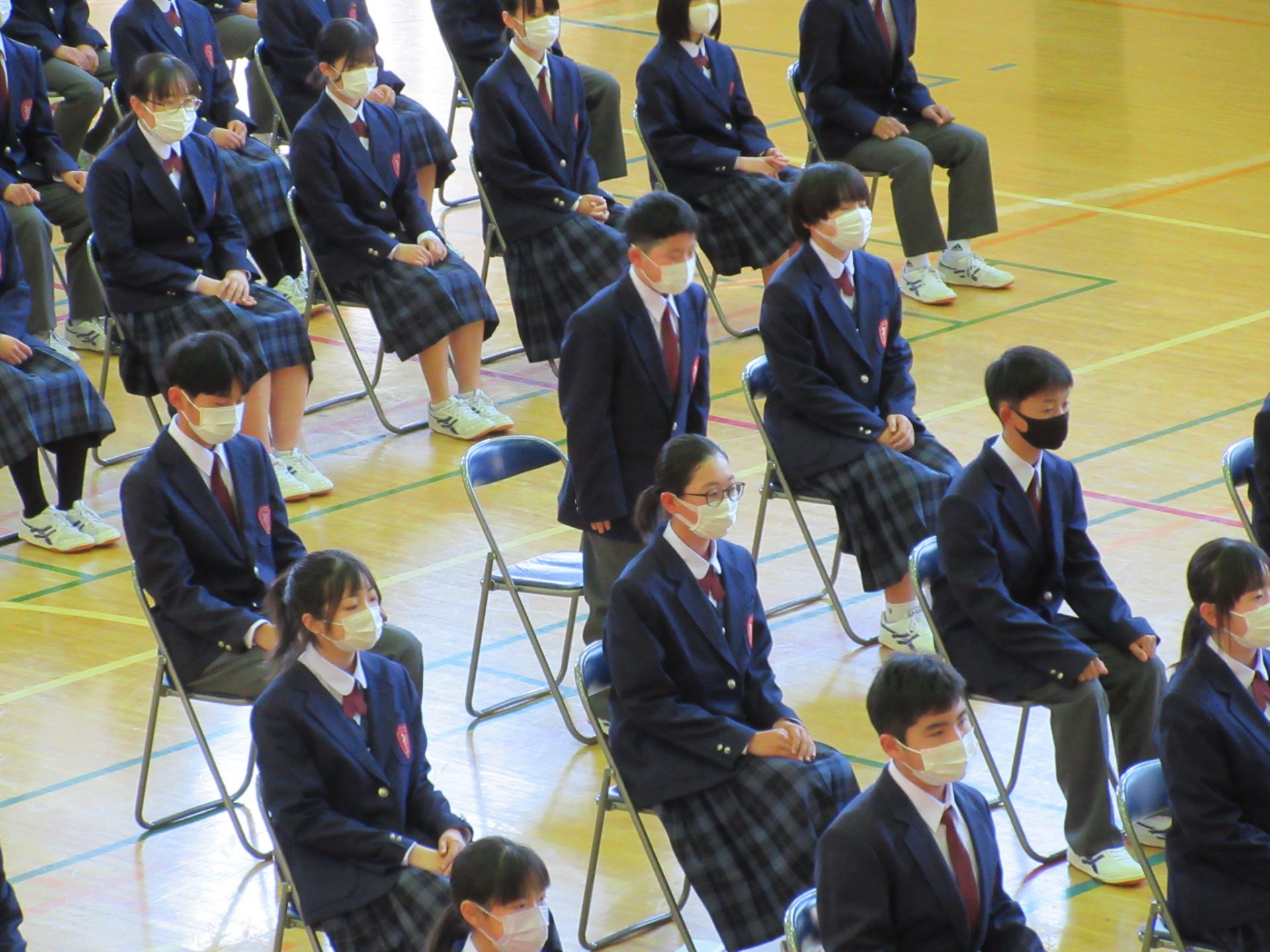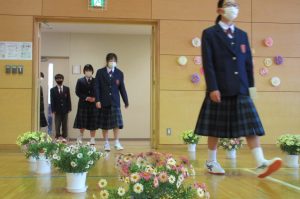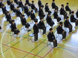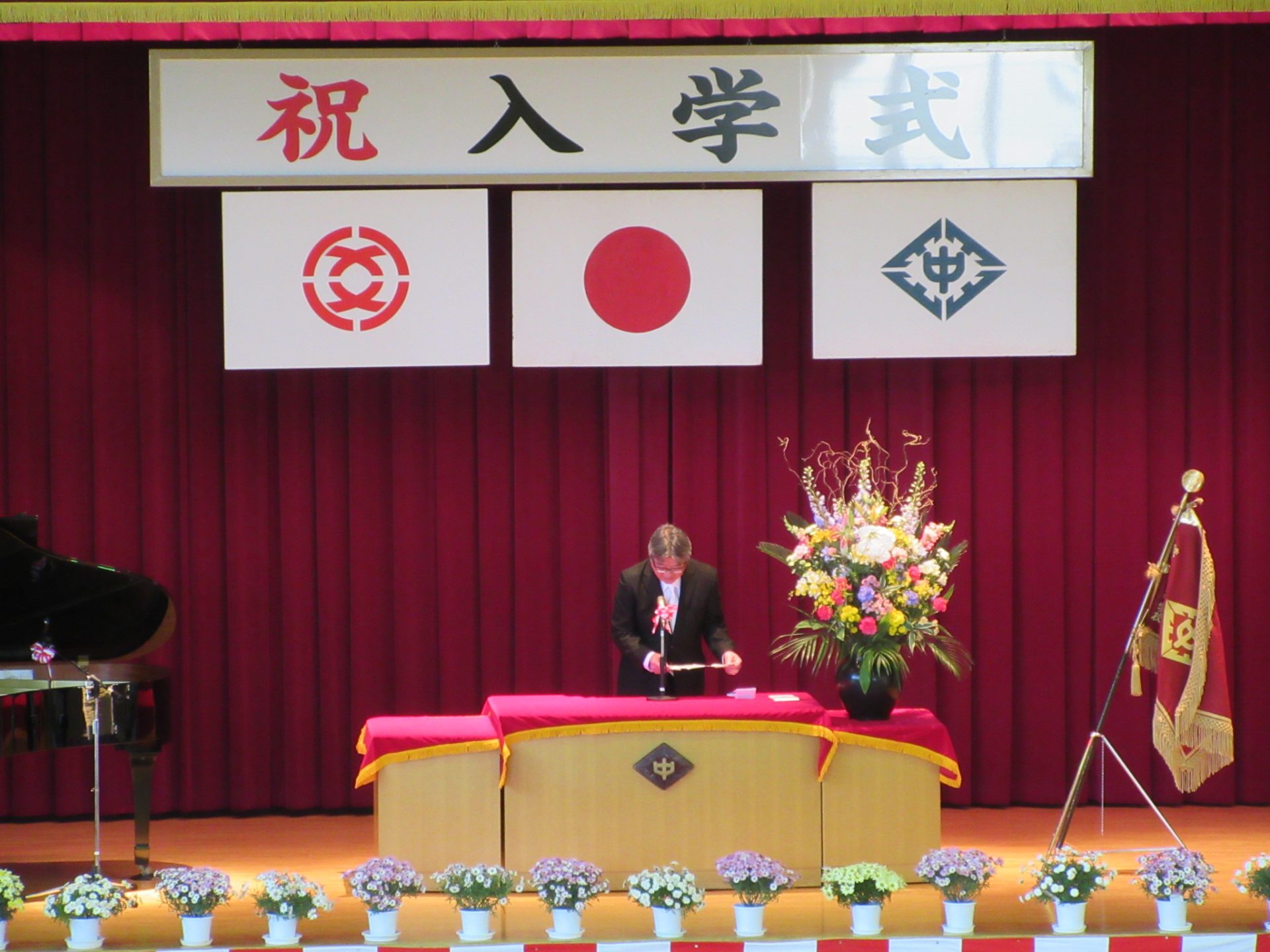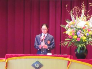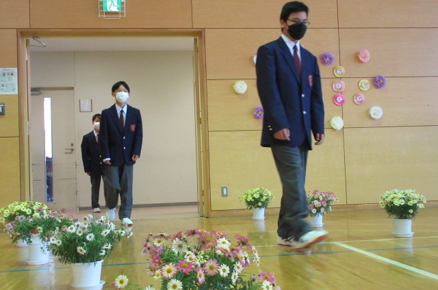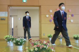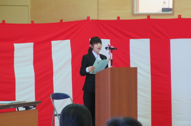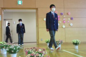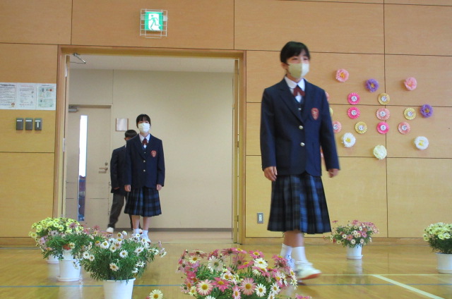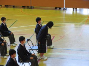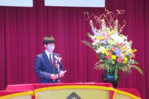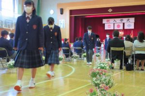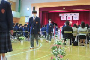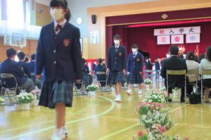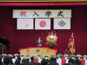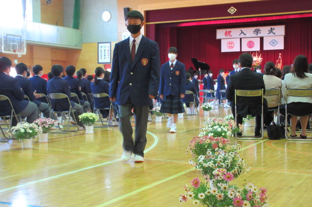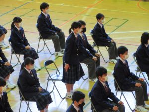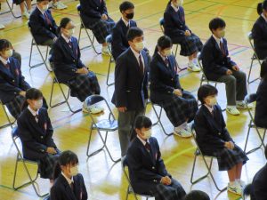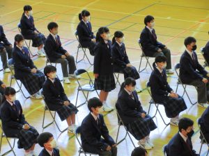 また、生徒会長からは、新入生の不安や緊張を少しでも軽くなるようにと中学校生活についての話がありました。「たった1度しかない中学校生活、1日1日を大切にし、何事にも全力で取り組んでほしい」と、歓迎の言葉が述べられました。そして新入生代表生徒からは、「文化祭や校外学習などの学校行事を頑張っていきたい」、「1日1日を大切に、感謝の気持ちを胸に充実した学校生活を過ごしていきたい」と力強く中学校生活への決意が述べられました。式を通して、新入生たちは終始立派な態度で、様々な人たちからの話を聞いていました。参会者からの激励の大きな拍手に包まれながら、中学校生活のスタートを切った1年生たちでした。