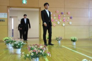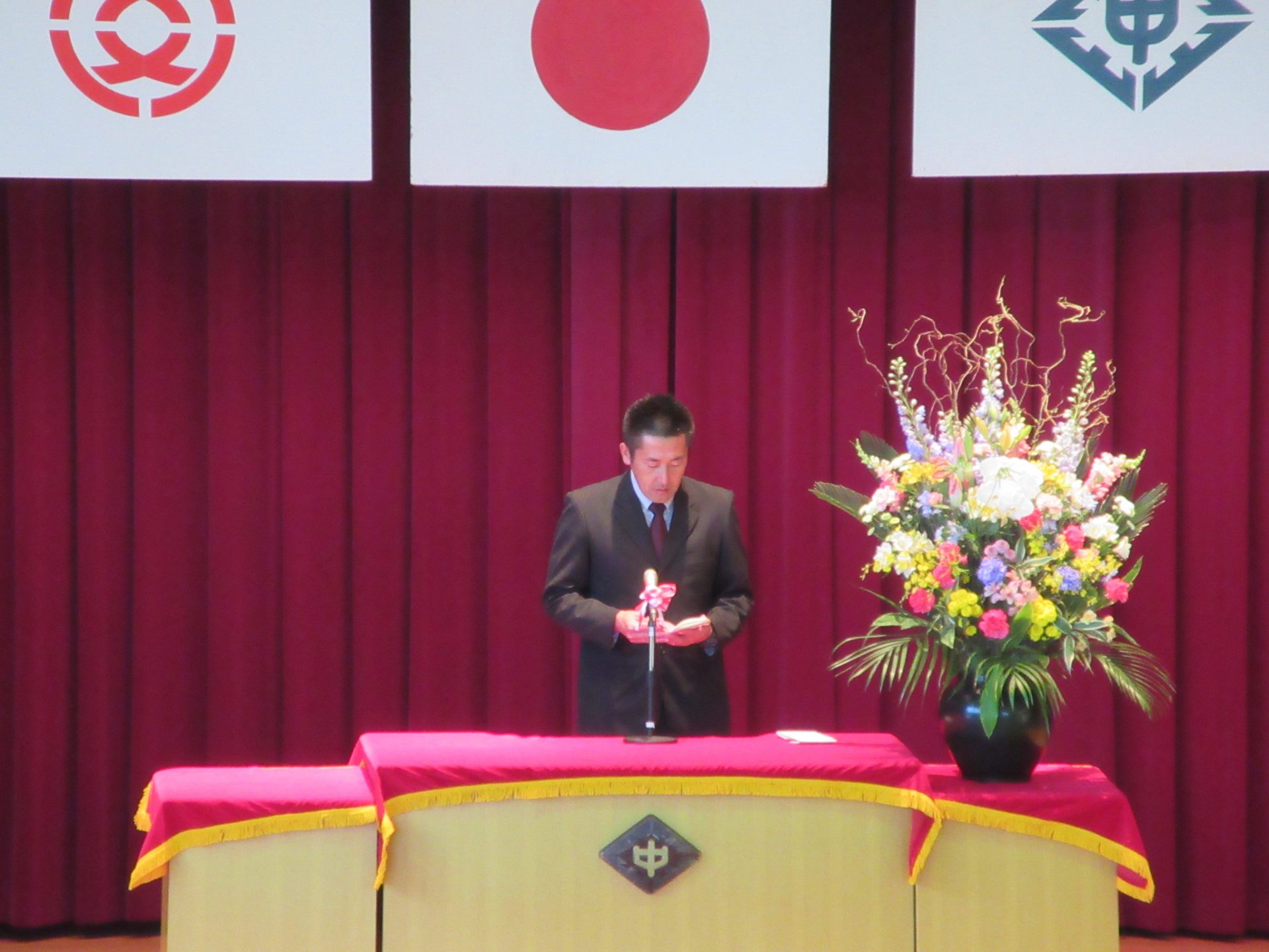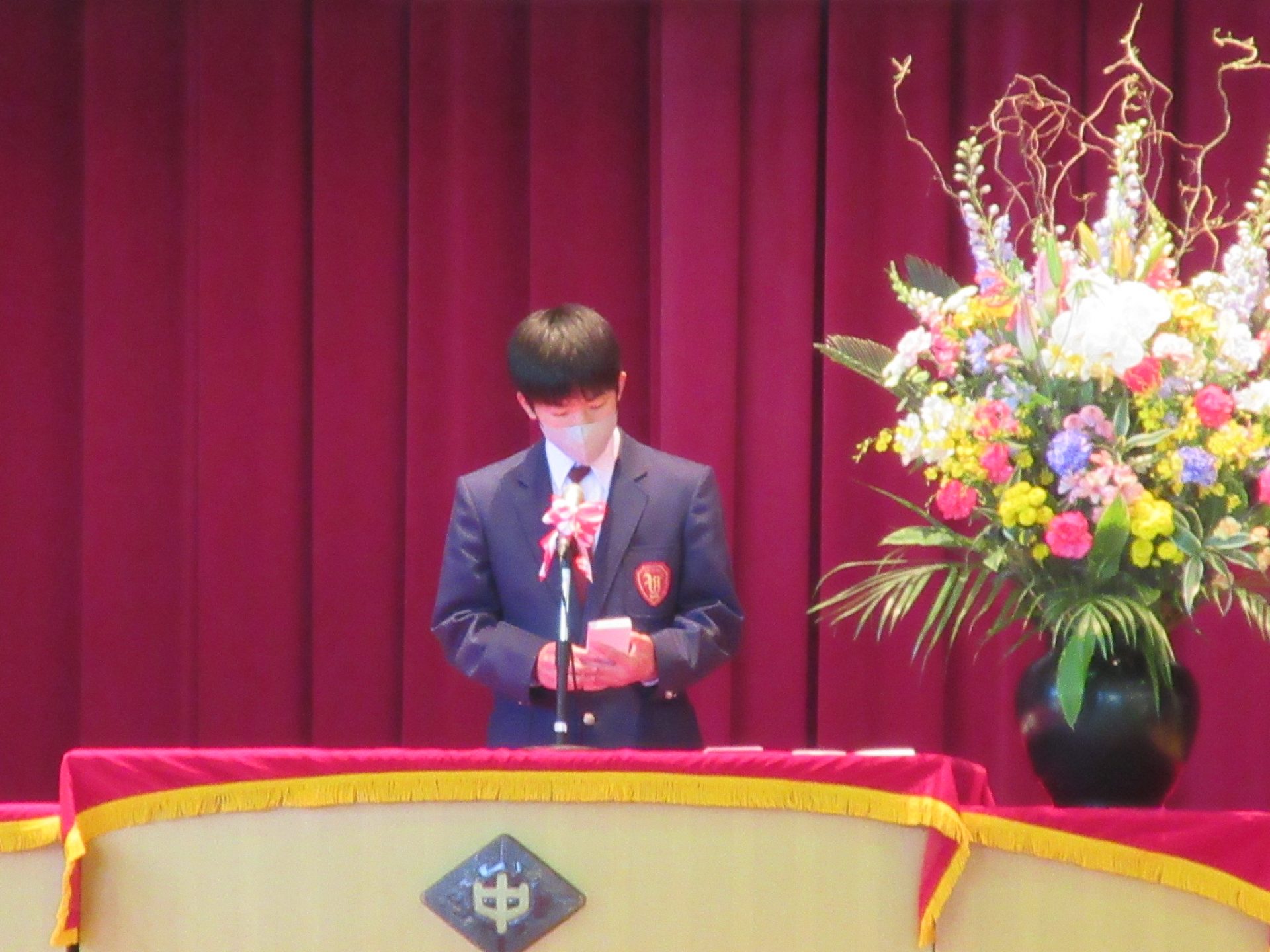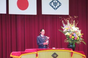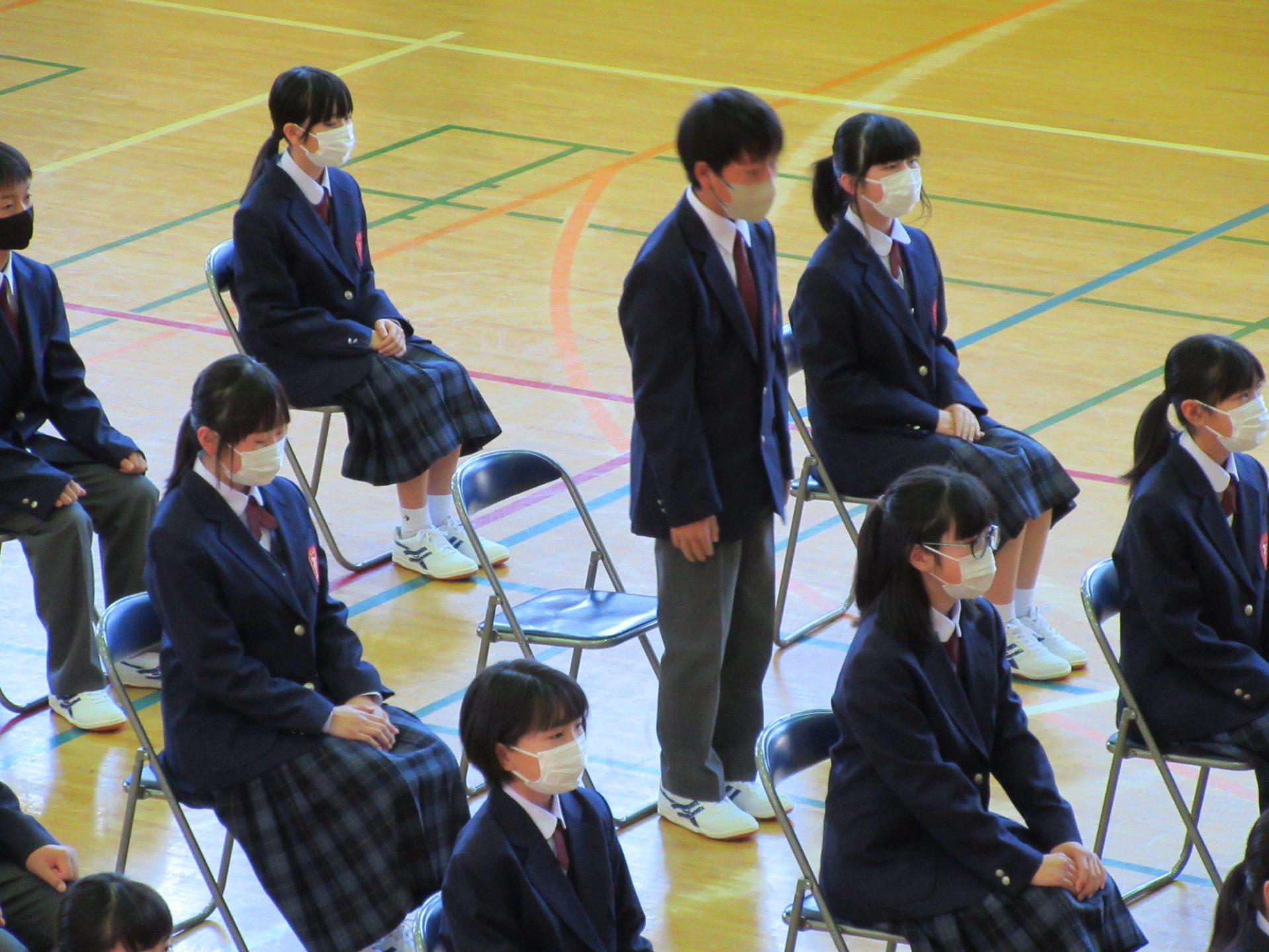 また、生徒会長からは、新入生の不安や緊張を少しでも軽くなるようにと中学校生活についての話がありました。「たった1度しかない中学校生活、1日1日を大切にし、何事にも全力で取り組んでほしい」と、歓迎の言葉が述べられました。そして新入生代表生徒からは、「文化祭や校外学習などの学校行事を頑張っていきたい」、「1日1日を大切に、感謝の気持ちを胸に充実した学校生活を過ごしていきたい」と力強く中学校生活への決意が述べられました。式を通して、新入生たちは終始立派な態度で、様々な人たちからの話を聞いていました。参会者からの激励の大きな拍手に包まれながら、中学校生活のスタートを切った1年生たちでした。