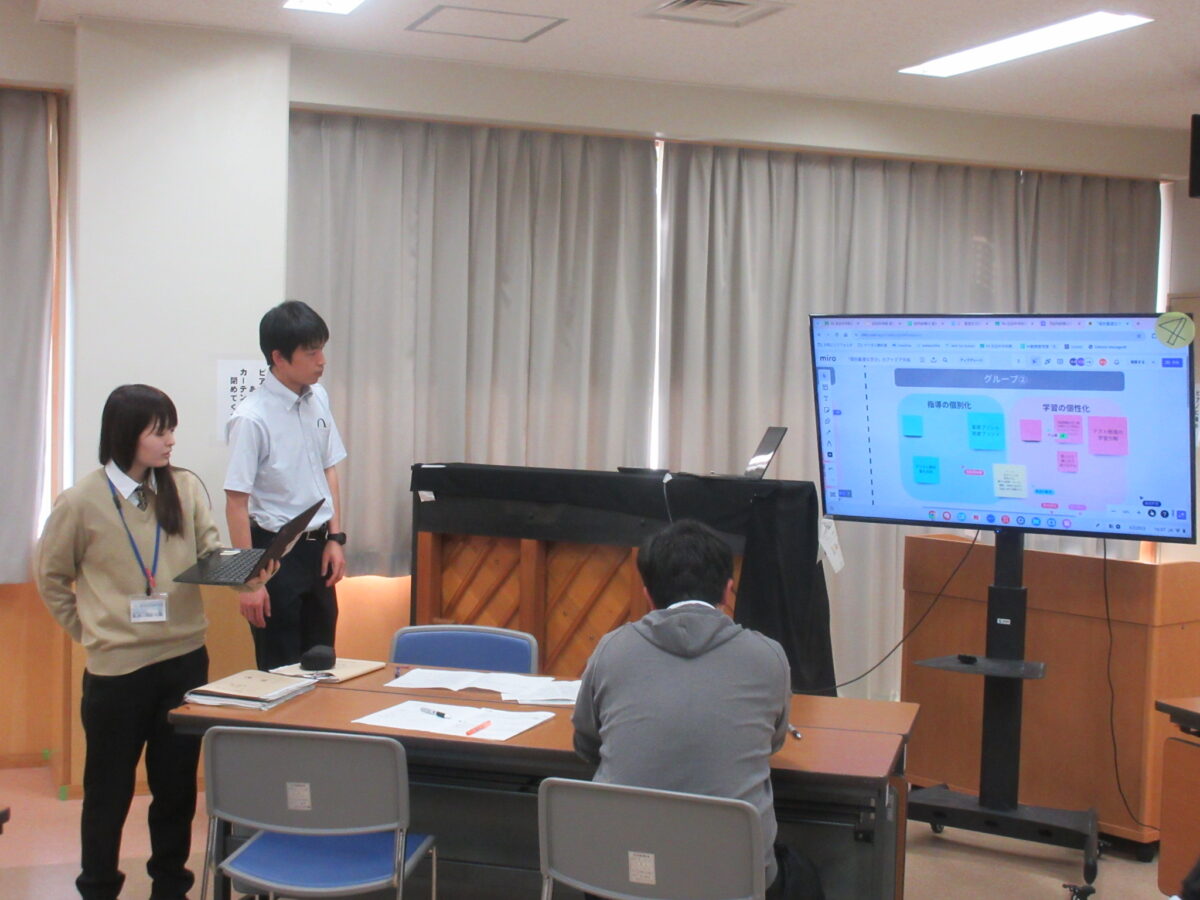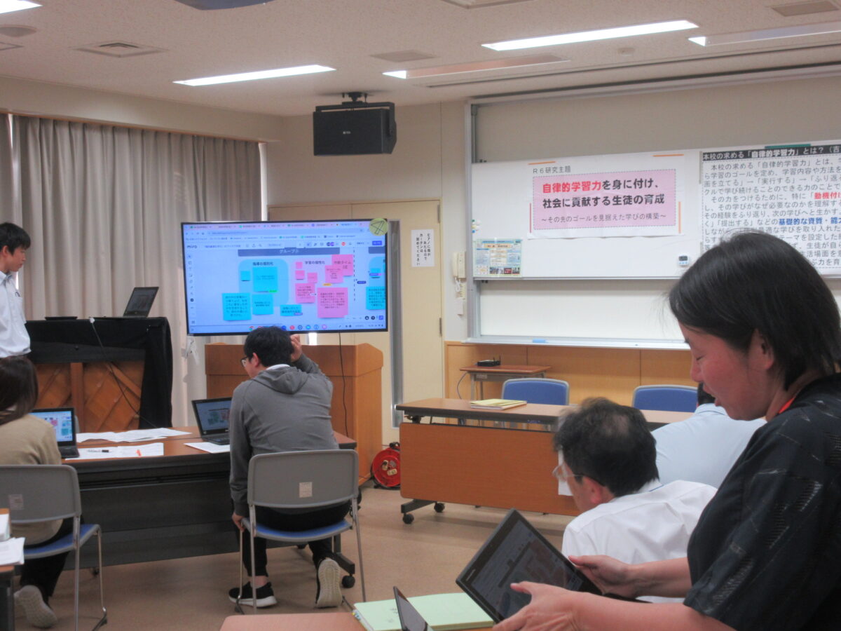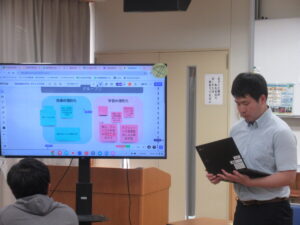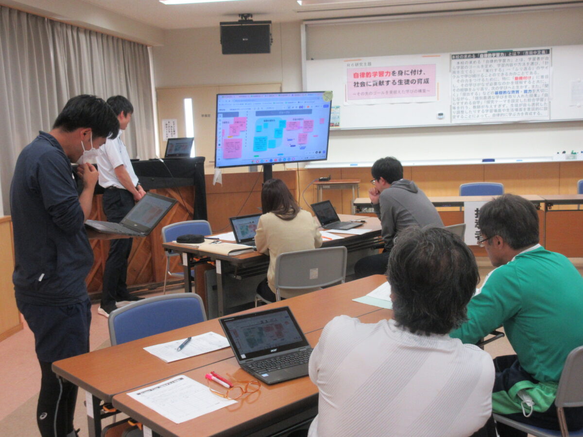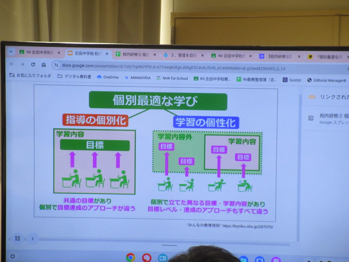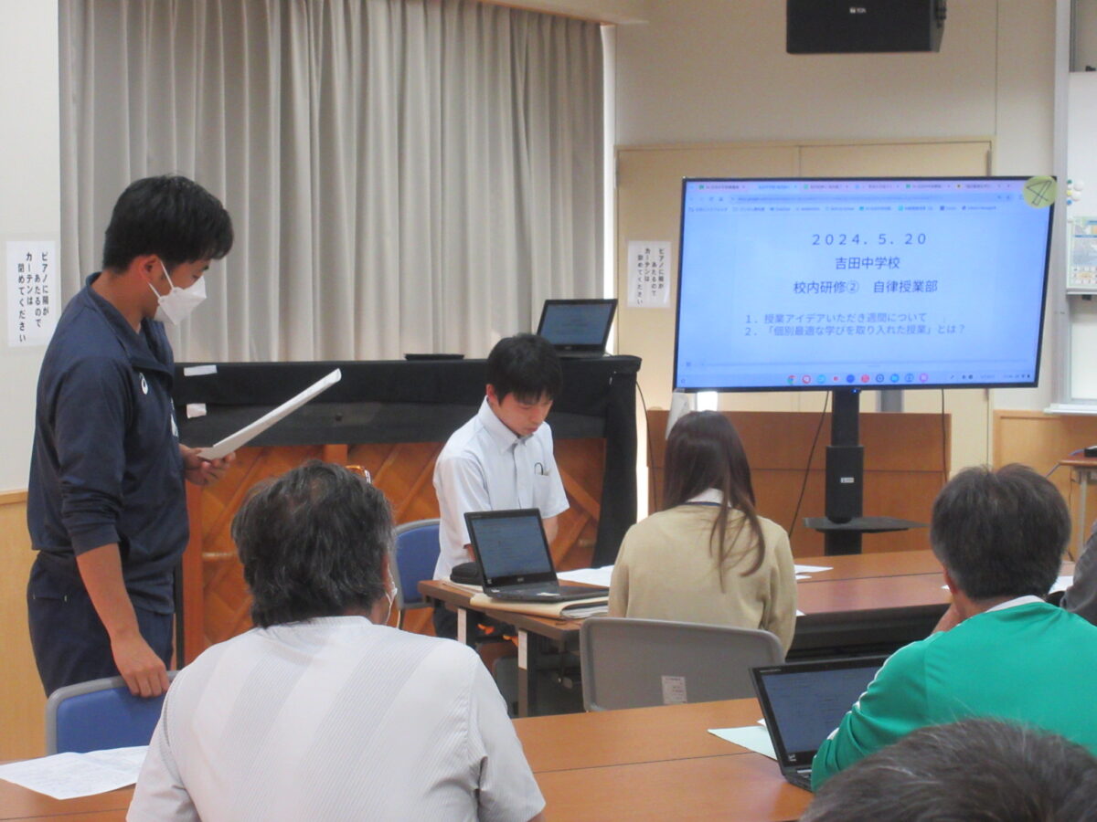 5月20日(月)校内研修を行いました。今回は自律授業部の提案と演習でした。まず、先生達同士で授業を見合い、意見交換をし合って、学び合う内容の提案がありました。次に、生徒への「個別最適な学び」の内容について学び、その上で、自分の授業でどのように具体化していくか、について、タブレットに入力し、共有しました。最後に、教育委員会の佐々島研究所長から、研究主任に向けて、今後の自律的な学び、個別最適な学びなど、今後の校内研修の方向性について御指導をいただきました。自律授業部の先生、お疲れ様でした。佐々島研究所長様、御指導ありがとうございました。明日より、先生たち同士で授業を見合う「授業アイデアいただき週間」がスタートします。