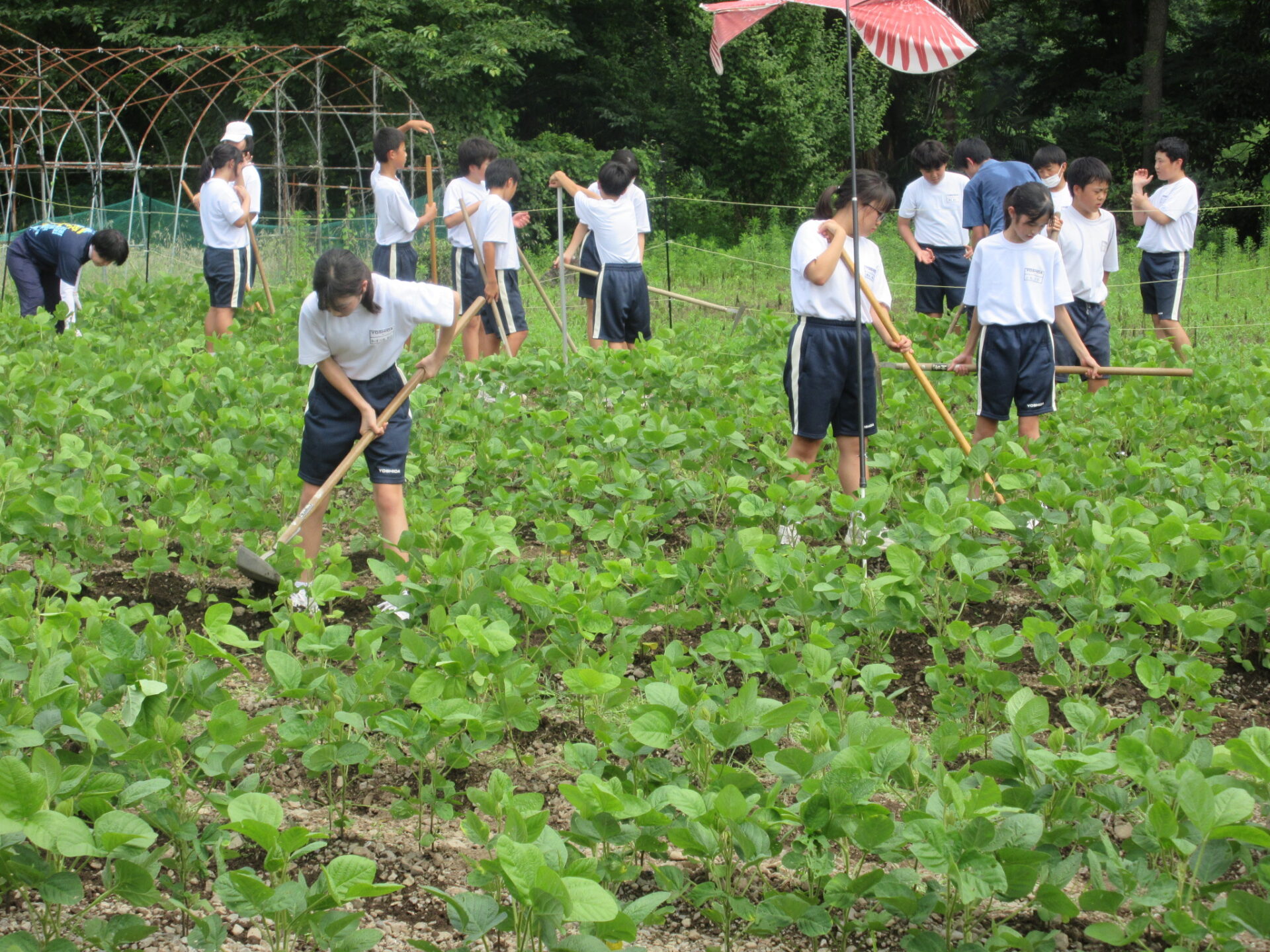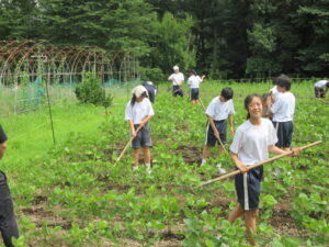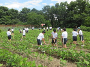 7月17日には、1年生の総合的な学習の時間において、借金なし大豆栽培の取組を行いました。今日は2回目の「土寄せ」作業を行いました。伸びた大豆がこの後更に葉を広げ実をつけるときに倒れないようにするために土台をしっかりと作る作業です。雨が心配されましたが、なんとか天気ももって作業を行うことができました。本日は指導者の方はいない日でしたが、指導者の方々から教わったことをもとに、1年生たちは土寄せの作業、畑の整備を行いました。むし暑い中でしたがよく頑張りました。