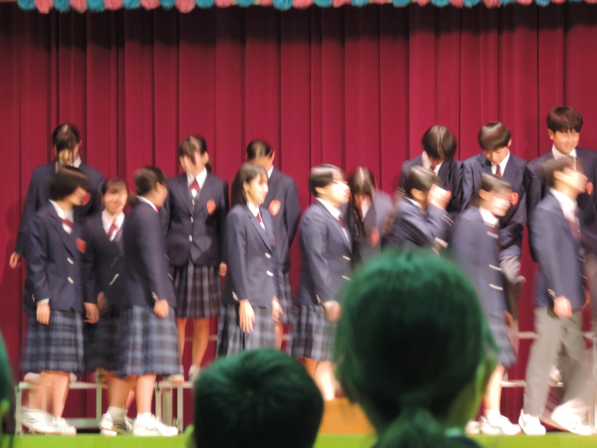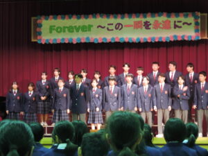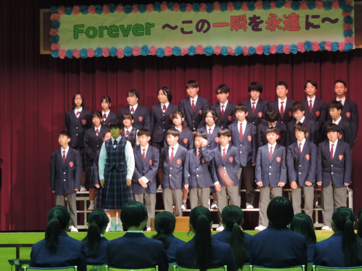 まずは合唱コンクールでした。今年度も「コンクール形式」で行いました。マイコプラズマ等の感染によって十分な練習ができない状況がありましたが、それでも今あるベストのコーラスをどの学年も聞かせてくれました。ここまでの放課後や音楽の授業での練習する姿に成長が感じられました。聞いている人すべての心に生徒たちの歌声が届き、元気を与えてくれたことと思います。生徒の皆さん、素晴らしい合唱をありがとうございました。