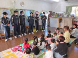 最後に遊戯室に3~5歳児が集まり、お別れ会をしてもらいました。