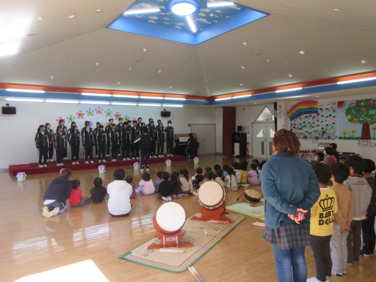 園児たちのかわいい合唱のあとは、3年生が先日の文化祭でも歌った歌を披露しました。「ドキドキしました。」「感動しました。」という声をいただきました。その後、さらに5歳児クラスの子たちが屋台囃子を披露してくれました。とても上手でした。