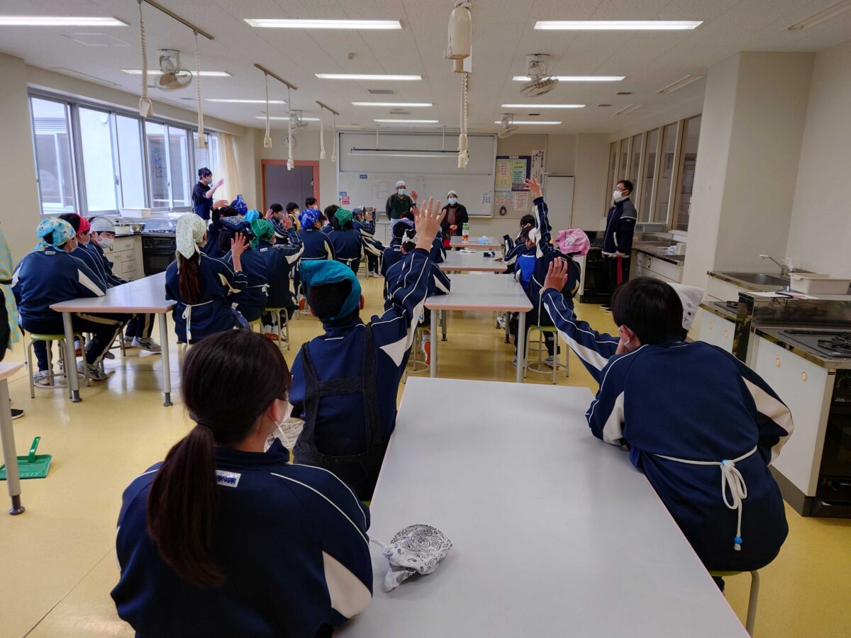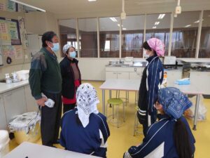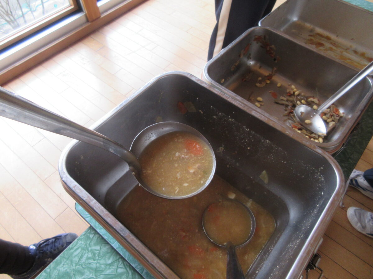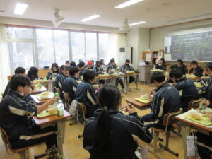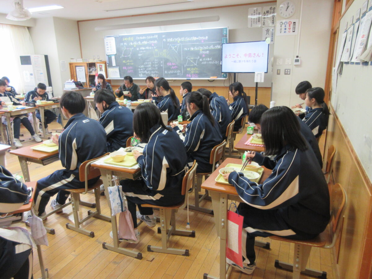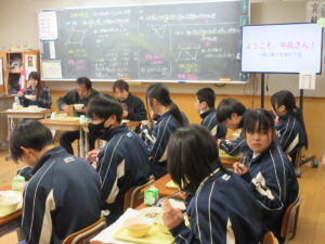 また、昨年度の1年生、つまり今年度の2年生が11月に樽から出した味噌を使って、豚汁を北部共同調理場の皆さんにつくっていただきました。本日の給食のメニューになりました。お世話になった2年生が指導者の方々と一緒に給食を食べました。「いつもより甘い味がしておいしい」と好評でした。