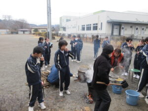 指導者の方々には、大きな釜に前日から水に浸した大豆を入れ、その釜をかまどにセットし、昨日から準備していた薪を燃して、大豆の煮る作業を朝早くから行っていただきました。丁寧に灰汁を取りながら大豆が柔らかくなるまで煮込む作業を数時間。その途中には、1年生たちが外に出てかまどの周りに集まり、薪をくべたり、浮き出てきた灰汁取りなどをしたり、煮汁をいただいたりと貴重な体験をすることができました。