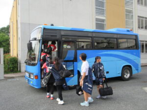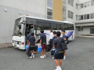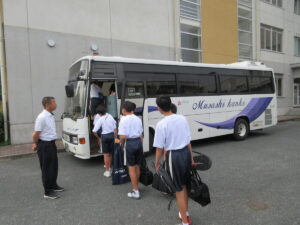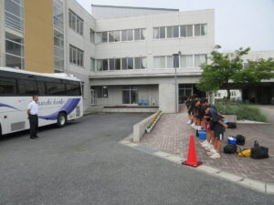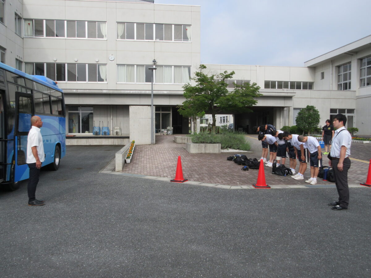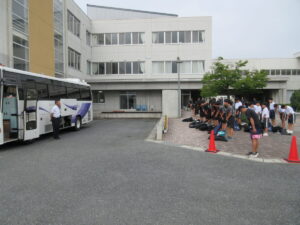 6月20日朝、サッカー、男女ソフトテニス、柔道が会場に向けて出発しました。本日もかなりの暑さと湿度が予想されます。体調に気をつけて、がんばってほしいです。