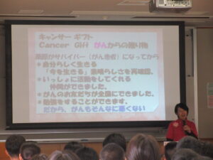 代表理事の栗原様からは、ピンクリボンの会についての説明や、がんについてのお話や、がん等に関するクイズを出していただきました。