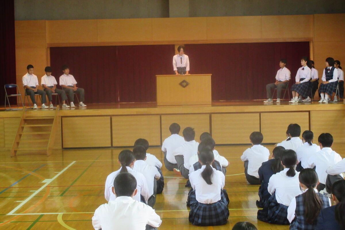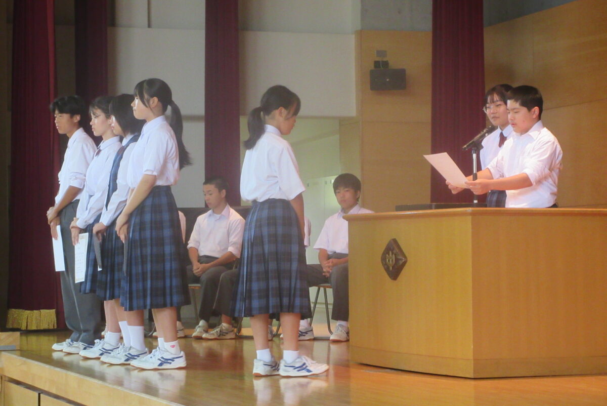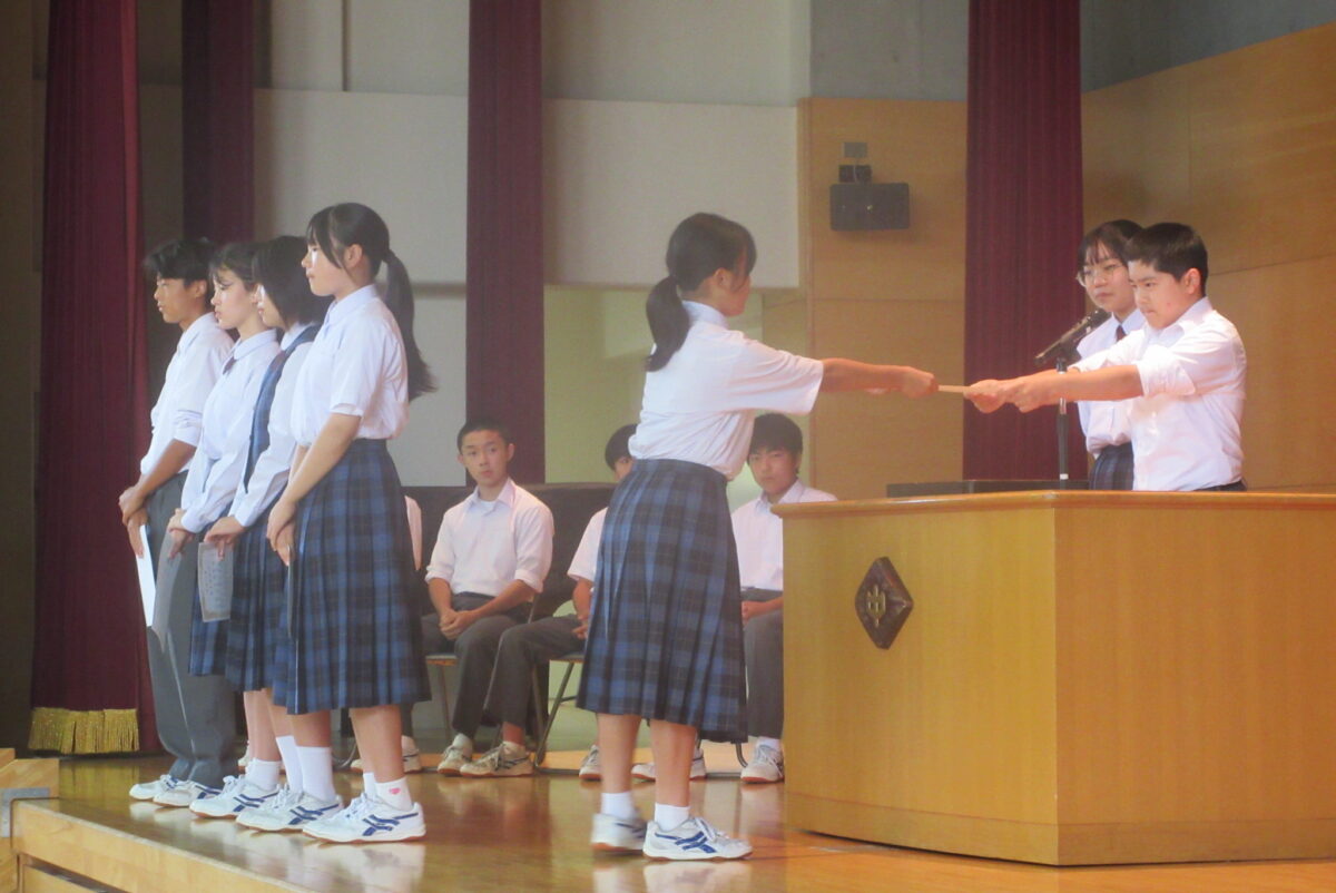 10月2日の生徒朝会では、先日の生徒会役員選挙の認定証書授与式が行われました。はじめの言葉ののち、新旧役員が壇上に上がりました。そして、選挙管理委員長の矢嶌さんが新生徒会員一人一人に認定証を渡しました。次に、前生徒会長の松本さんからの言葉があり、そして新生徒会長の新井さんが決意を述べました。なお、執行委員が1名不足しているため、選挙規定にのっとり、補欠選挙を行うことが発表されました。新生徒会にも、大いに期待をしています。学校のため、生徒たちのためにがんばってほしいです。