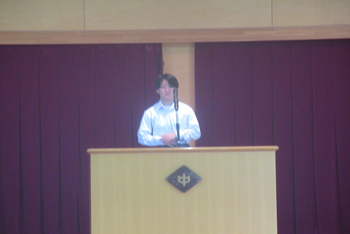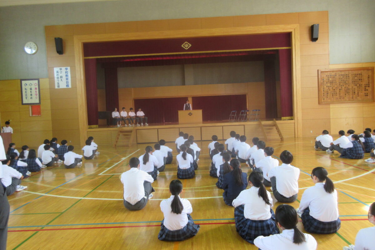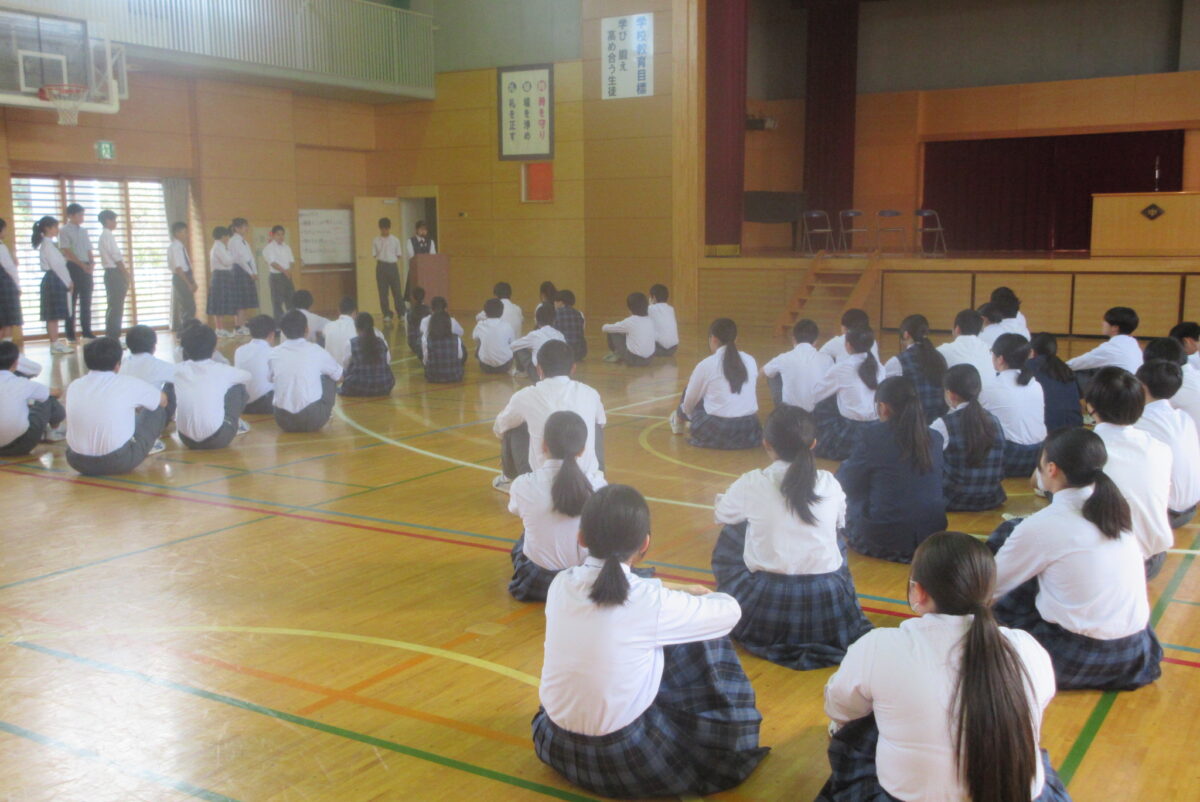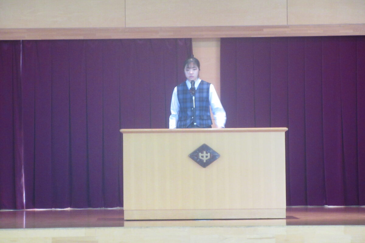 10月2日の生徒朝会では、先日の生徒会役員選挙の認定証書授与式が行われました。はじめの言葉ののち、新旧役員が壇上に上がりました。そして、選挙管理委員長の矢嶌さんが新生徒会員一人一人に認定証を渡しました。次に、前生徒会長の松本さんからの言葉があり、そして新生徒会長の新井さんが決意を述べました。なお、執行委員が1名不足しているため、選挙規定にのっとり、補欠選挙を行うことが発表されました。新生徒会にも、大いに期待をしています。学校のため、生徒たちのためにがんばってほしいです。