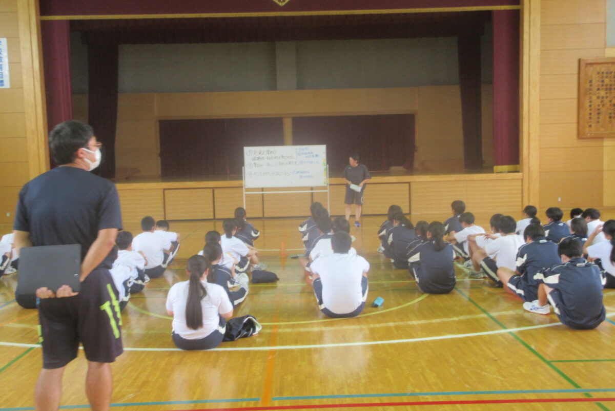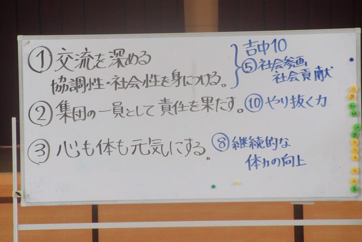 まず体育担当から、体育祭のねらいと、ねらいに関連する吉中10(吉中生に育成を目指す10の資質・能力)について話がありました。後ほど生徒は体育祭前に、「ぽ!」というポートフォリオに、この10の資質能力のどれを特に伸ばしていくかを記録し、意識して体育祭練習、当日へと臨みます。