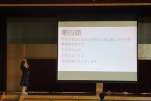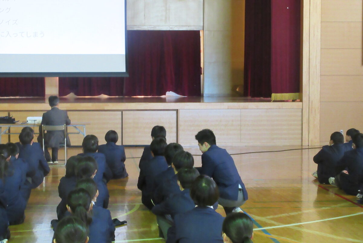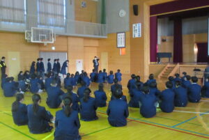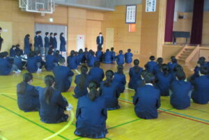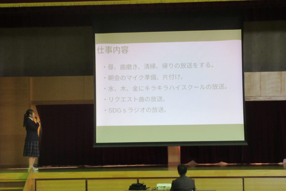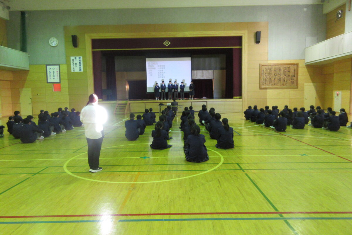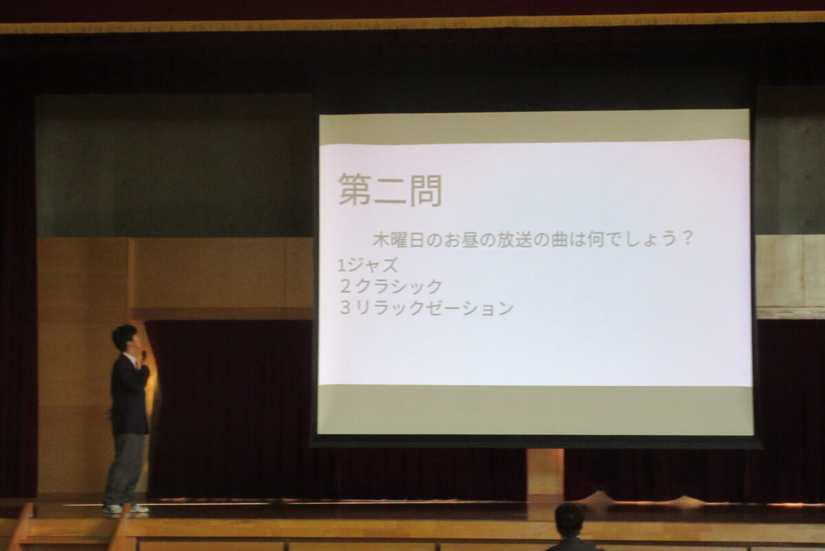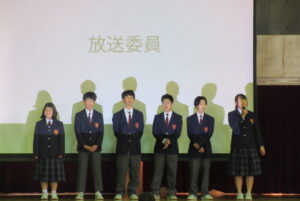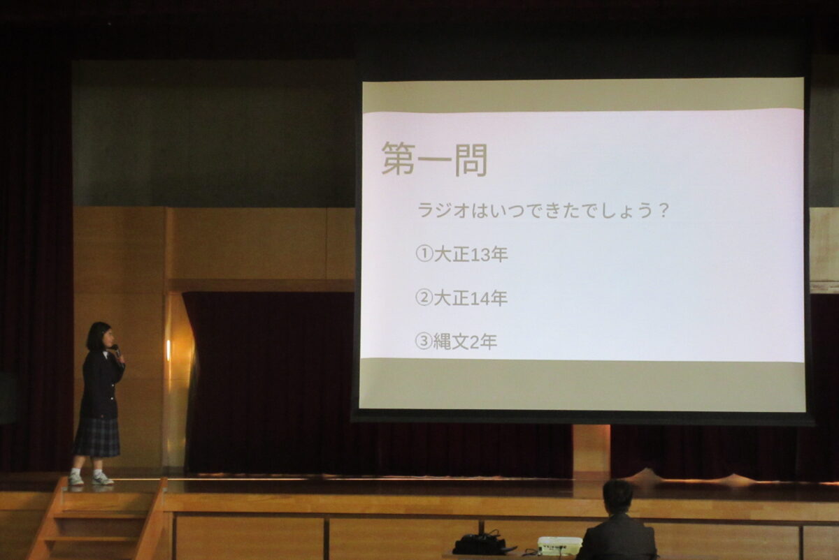 12月17日の朝には、全校朝会(放送委員発表)がありました。最初に放送委員の生徒たちが壇上で自己紹介をし、その後、活動内容の説明を行いました。次に、クイズを出題しました。1問ごとに、指定した生徒にマイクを向けて、回答を聞きました。正解者には拍手が出ていました。工夫したクイズの数々でとてもよかったです。これからもよい放送を期待しています。