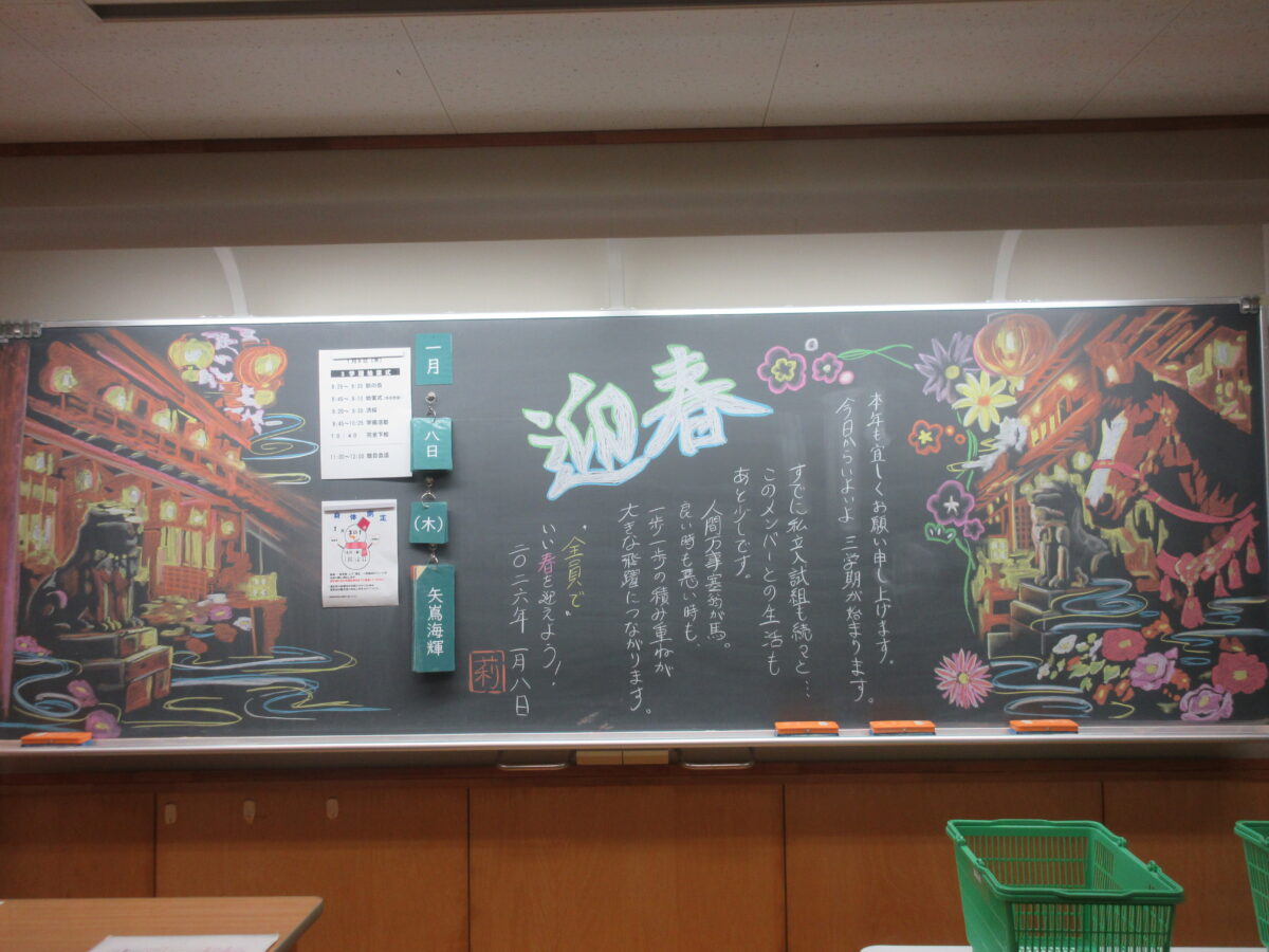1月7日の夕方に教室を回りました。担任からのメッセージが書かれていました。一部の教室を紹介します。