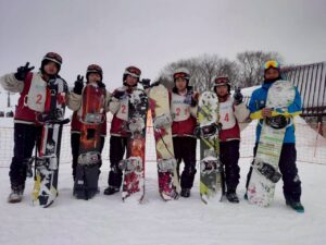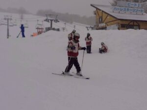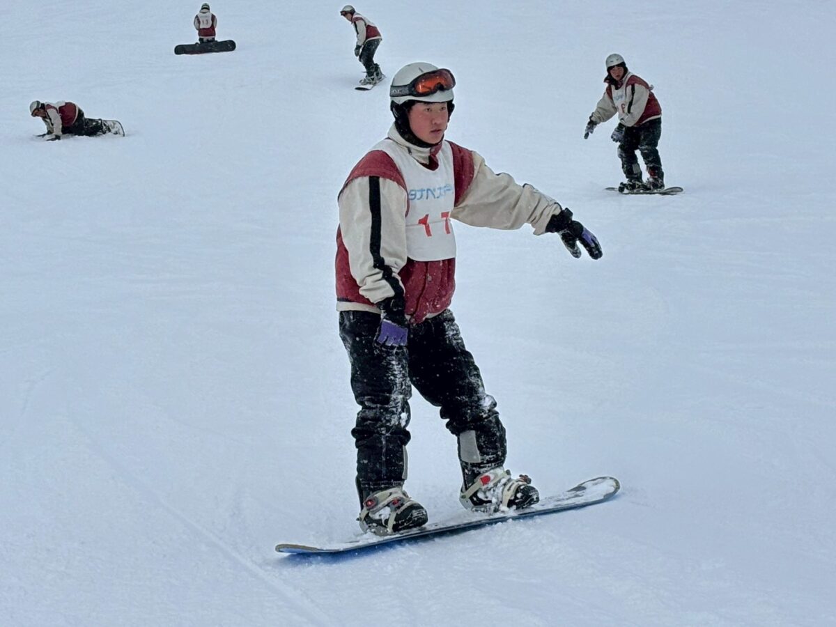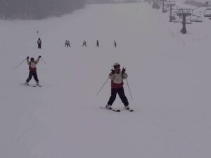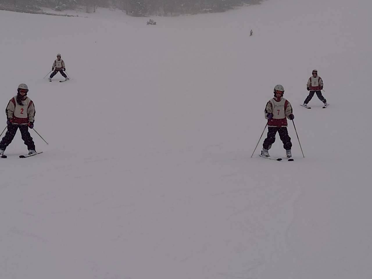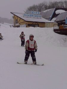 斜面を降りてくる生徒たち。午前中とはくらべものにならないくらい上達している様子に驚きました。もう一般客のスキーヤー、ボーダーと遜色ない生徒もいました。インストラクターさんからも、「みんな上達が早いですね。」「すごくがんばる子たちですね。」とおほめの言葉をいただきました。そして、インストラクターさんにあいさつをして、午後の講習が終了。その後、インストラクターさんと一緒に記念撮影をしました。その後、自由滑走となりました。何度もリフトに乗る生徒、何度も滑ってチャレンジする生徒もたくさんいました。現在、ロッジに戻って休憩中です。これから夕食となります。