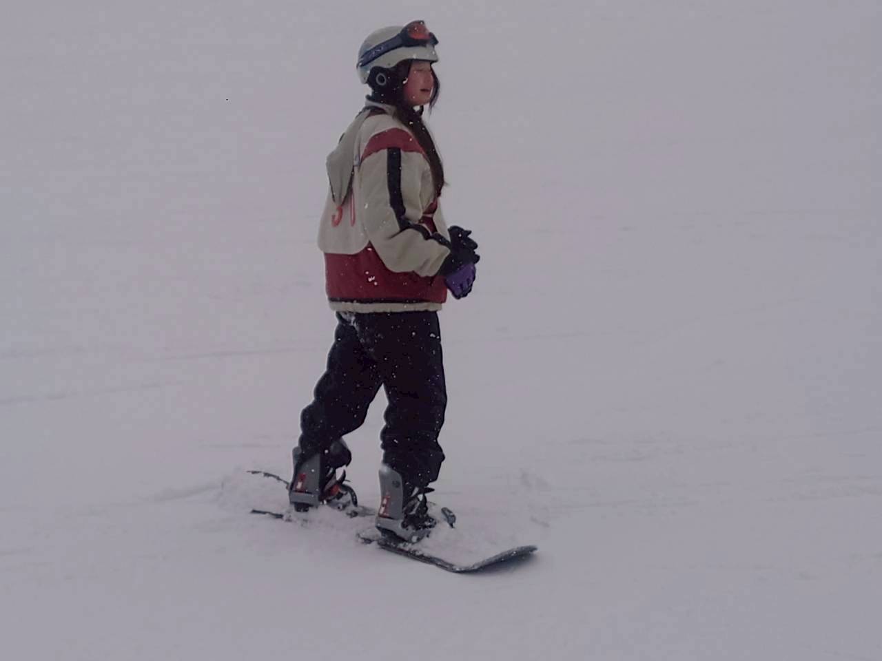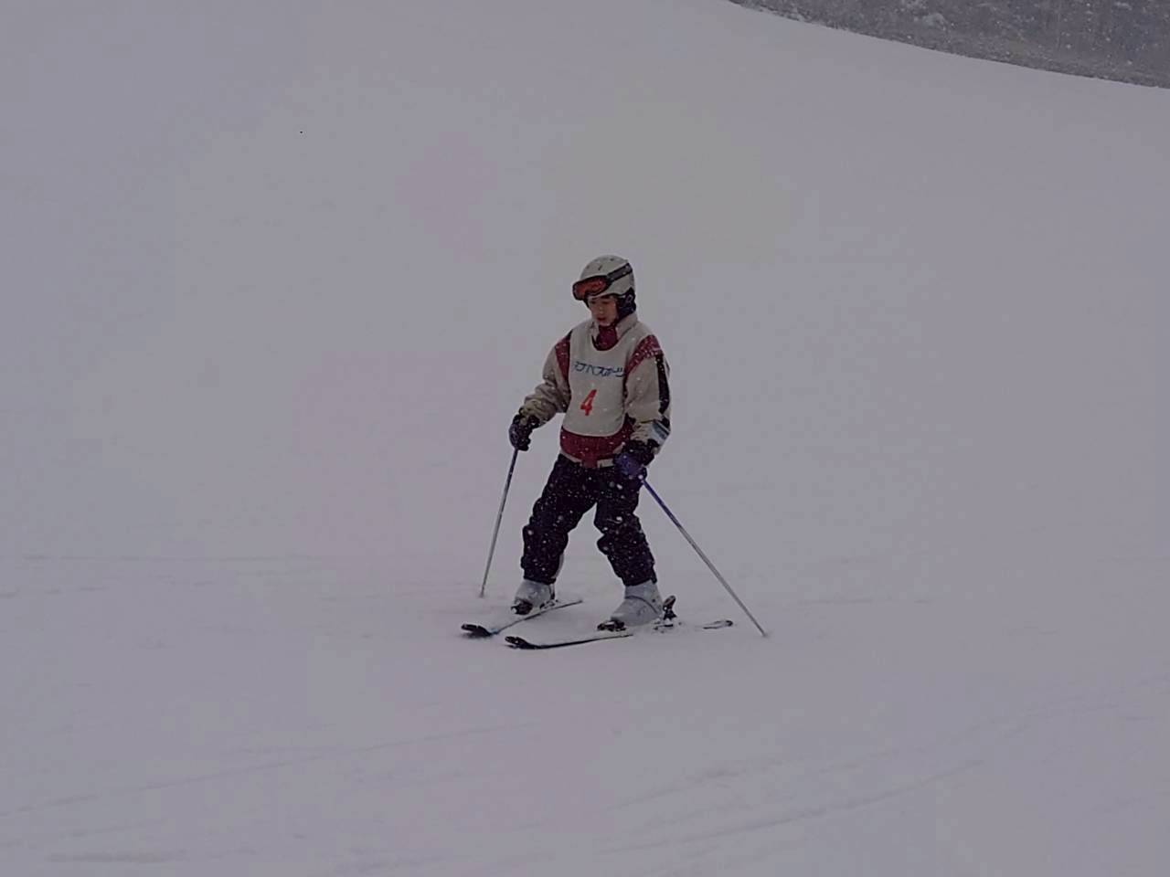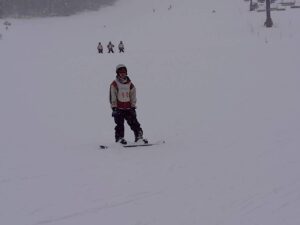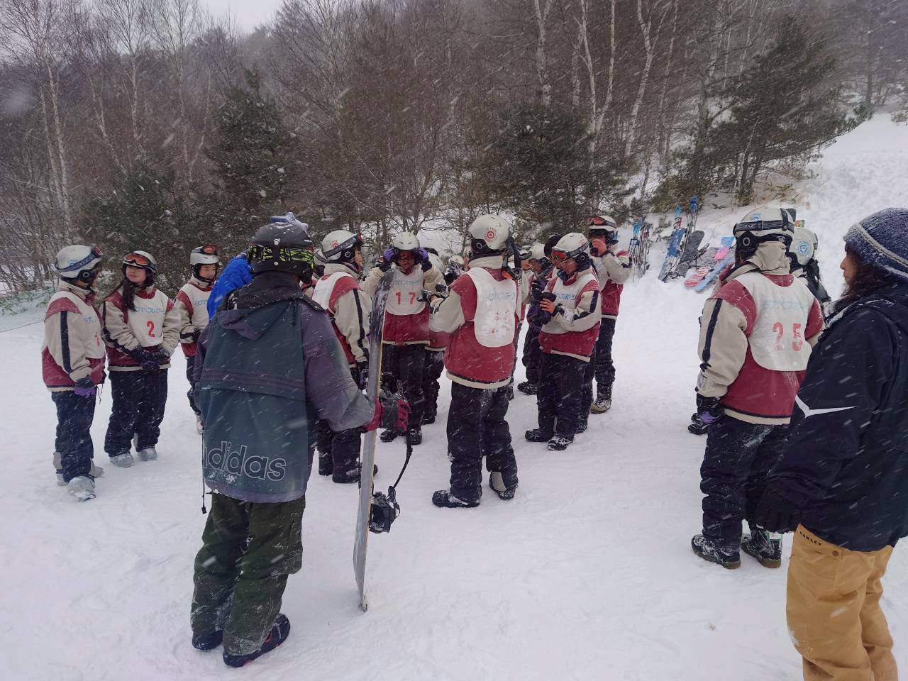 斜面を降りてくる生徒たち。午前中とはくらべものにならないくらい上達している様子に驚きました。もう一般客のスキーヤー、ボーダーと遜色ない生徒もいました。インストラクターさんからも、「みんな上達が早いですね。」「すごくがんばる子たちですね。」とおほめの言葉をいただきました。そして、インストラクターさんにあいさつをして、午後の講習が終了。その後、インストラクターさんと一緒に記念撮影をしました。その後、自由滑走となりました。何度もリフトに乗る生徒、何度も滑ってチャレンジする生徒もたくさんいました。現在、ロッジに戻って休憩中です。これから夕食となります。