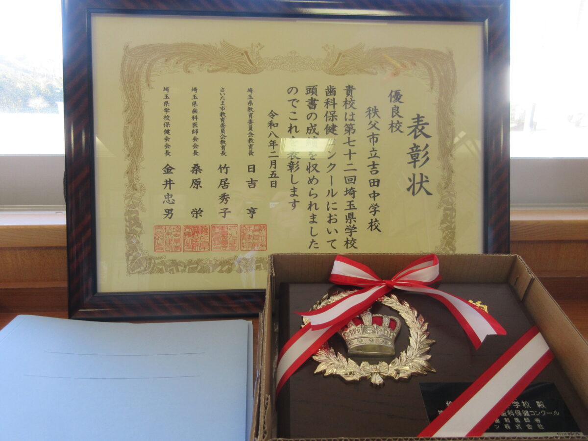 第72回埼玉県学校歯科保健コンクールにおいて、吉田中学校が、優良賞をいただきました。これも、保護者の皆様のご協力のおかげと思います。ありがとうございました。今後ともどうぞよろしくお願いいたします。