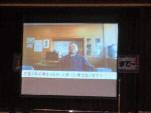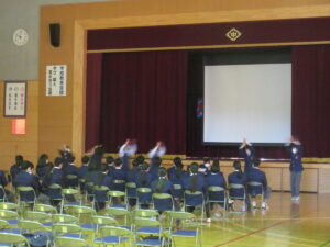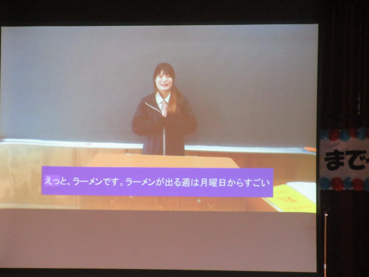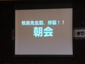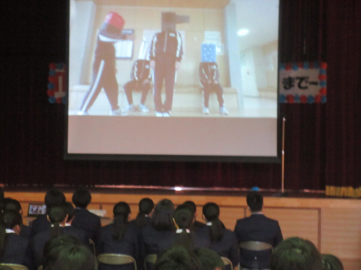 次の職員の発表に続き、3年生の発表となりました。某映画泥棒を模した映像から始まり、これから何が起こるんだろう、と期待感を高めました。そして、校長や職員へのインタビューが次々と流れました。そして少し懐かしい写真も流れました。また最後に、壇上で、全員で担任への感謝の言葉を伝える場面はとても感動しました。