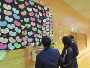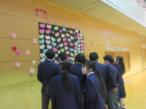 次の発表までの合間の時間に、3年生が掲示物の前に集まっていました。この掲示物には、1年生、2年生、職員からのメッセージが貼られていました。3年生に「想い」が届いたようでした。