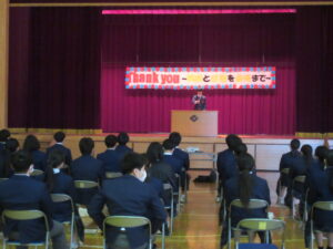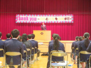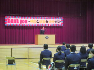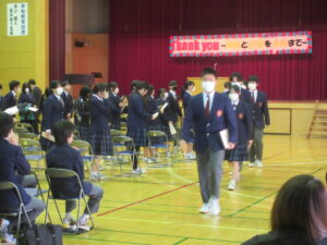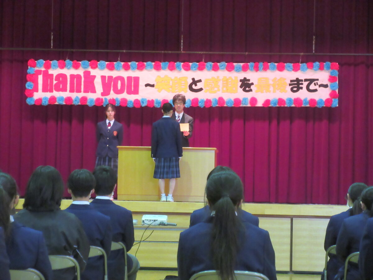 最後の閉会式です。開式の言葉のあと、テーマ小の授与がありました。今年のテーマは「Thank you ~笑顔と感謝を最後まで~」で、1年生の茅根さんの提案でした。素晴らしいテーマをありがとう。