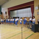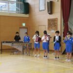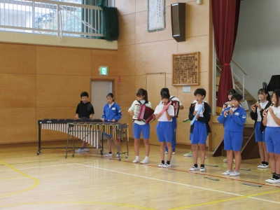 音楽朝会が行われ、6年生が詩の暗唱と合奏を披露しました。